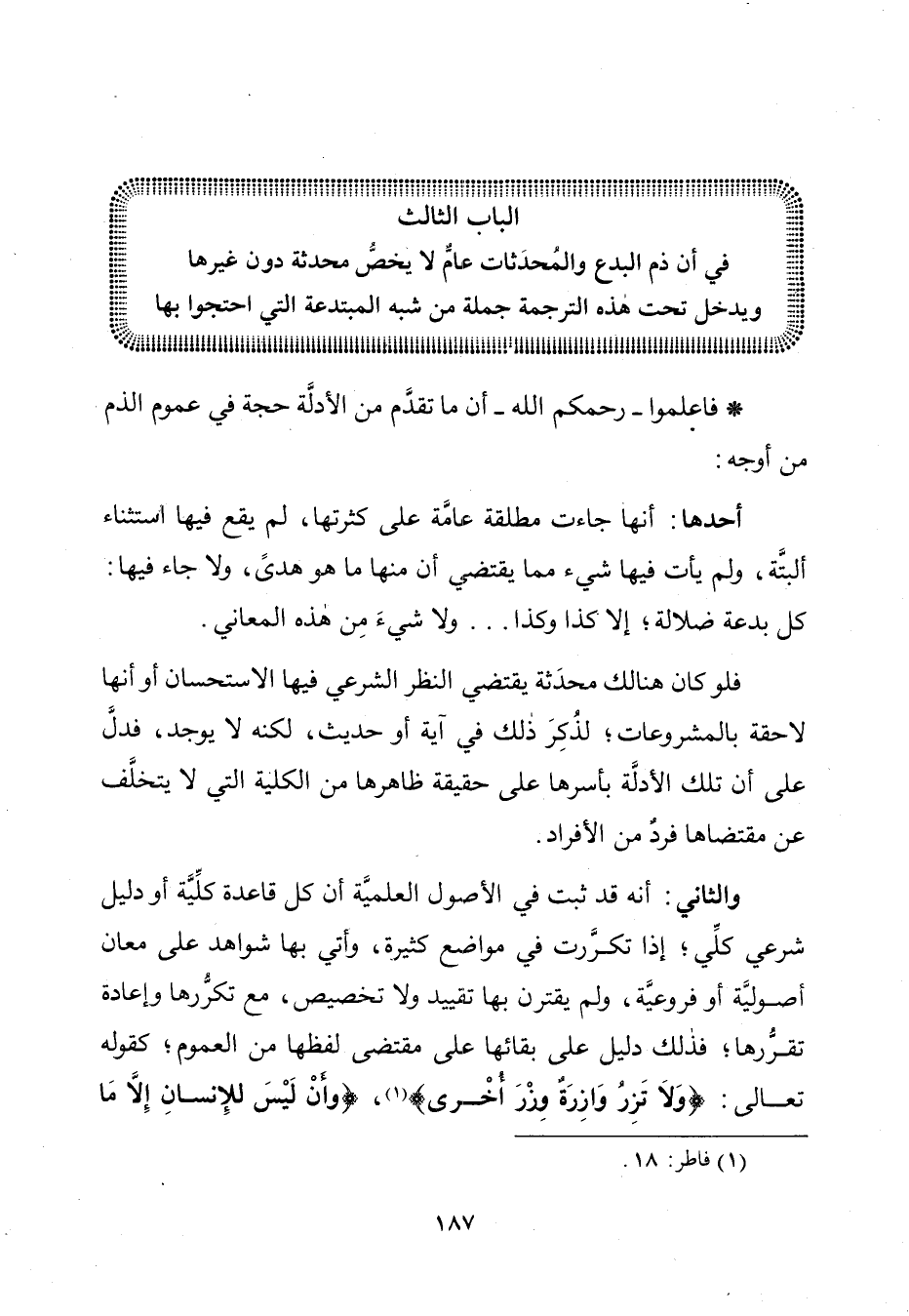 فِي أَنَّ ذَمَّ الْبِدَعِ وَالْمُحْدَثَاتِ عَامٌّ لَا يَخُصُّ مُحْدَثَةً دُونَ غَيْرِهَا وَيَدْخُلُ تَحْتَ هَذِهِ التَّرْجَمَةِ جُمْلَةٌ مِنْ شُبَهِ الْمُبْتَدِعَةِ الَّتِي احْتَجُّوا بِهَا