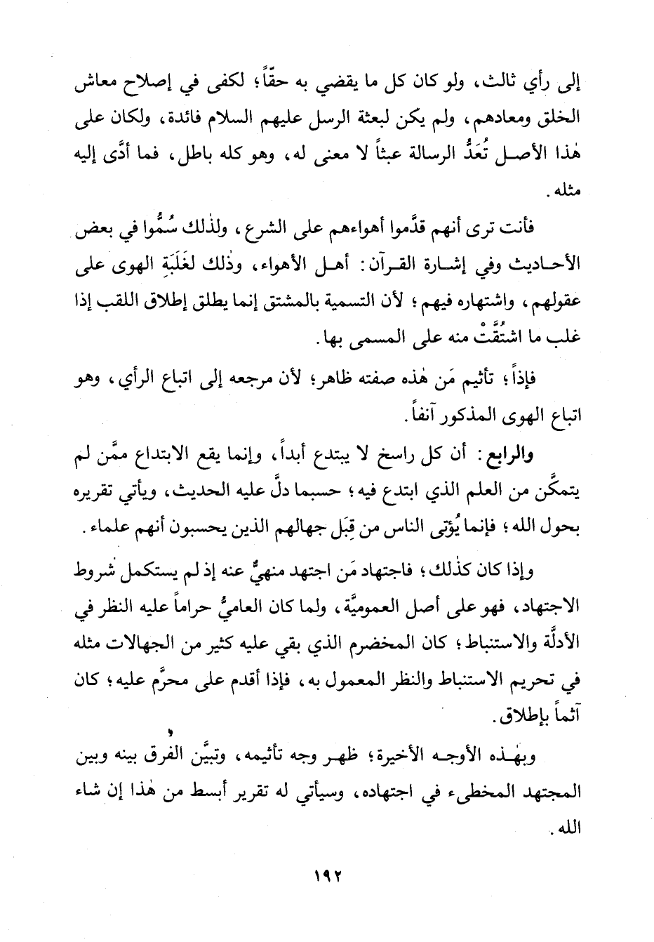 وَالرَّابِعُ: أَنَّ كُلَّ رَاسِخٍ لَا يَبْتَدِعُ أَبَدًا، وَإِنَّمَا يَقَعُ الِابْتِدَاعُ مِمَّنْ لَمْ يَتَمَكَّنْ مِنَ الْعِلْمِ الَّذِي ابْتَدَعَ فِيهِ، حَسْبَمَا دَلَّ عَلَيْهِ الْحَدِيثُ، وَيَأْتِي تَقْرِيرُهُ بِحَوْلِ اللَّهِ، فَإِنَّمَا يُؤْتَى النَّاسُ مِنْ قِبَلِ جُهَّالِهِمُ الَّذِينَ يَحْسَبُونَ أَنَّهُمْ عُلَمَاءُ.