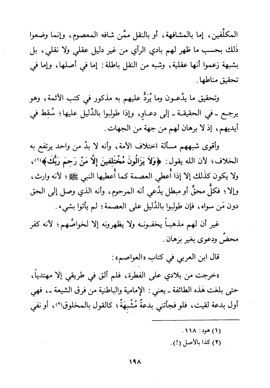 وَأَقْوَى شُبَهِهِمْ مَسْأَلَةُ اخْتِلَافِ الْأُمَّةِ، وَأَنَّهُ لَا بُدَّ مِنْ وَاحِدٍ يَرْتَفِعُ بِهِ الْخِلَافُ; لِأَنَّ اللَّهَ يَقُولُ: {وَلَا يَزَالُونَ مُخْتَلِفِينَ - إِلَّا مَنْ رَحِمَ رَبُّكَ} [هود: 118 - 119]، وَلَا يَكُونُ كَذَلِكَ إِلَّا إِذَا أُعْطِيَ الْعِصْمَةَ كَمَا أُعْطِيَهَا النَّبِيُّ صَلَّى اللَّهُ عَلَيْهِ وَسَلَّمَ، لِأَنَّهُ وَارِثٌ، وَإِلَّا فَكَلُّ مُحِقٍّ أَوْ مُبْطِلٍ يَدَّعِي أَنَّهُ الْمَرْحُومُ، وَأَنَّهُ الَّذِي وَصَلَ إِلَى الْحَقِّ دُونَ مَنْ سِوَاهُ، فَإِنْ طُولِبُوا بِالدَّلِيلِ عَلَى الْعِصْمَةِ; لَمْ يَأْتُوا بِشَيْءٍ.