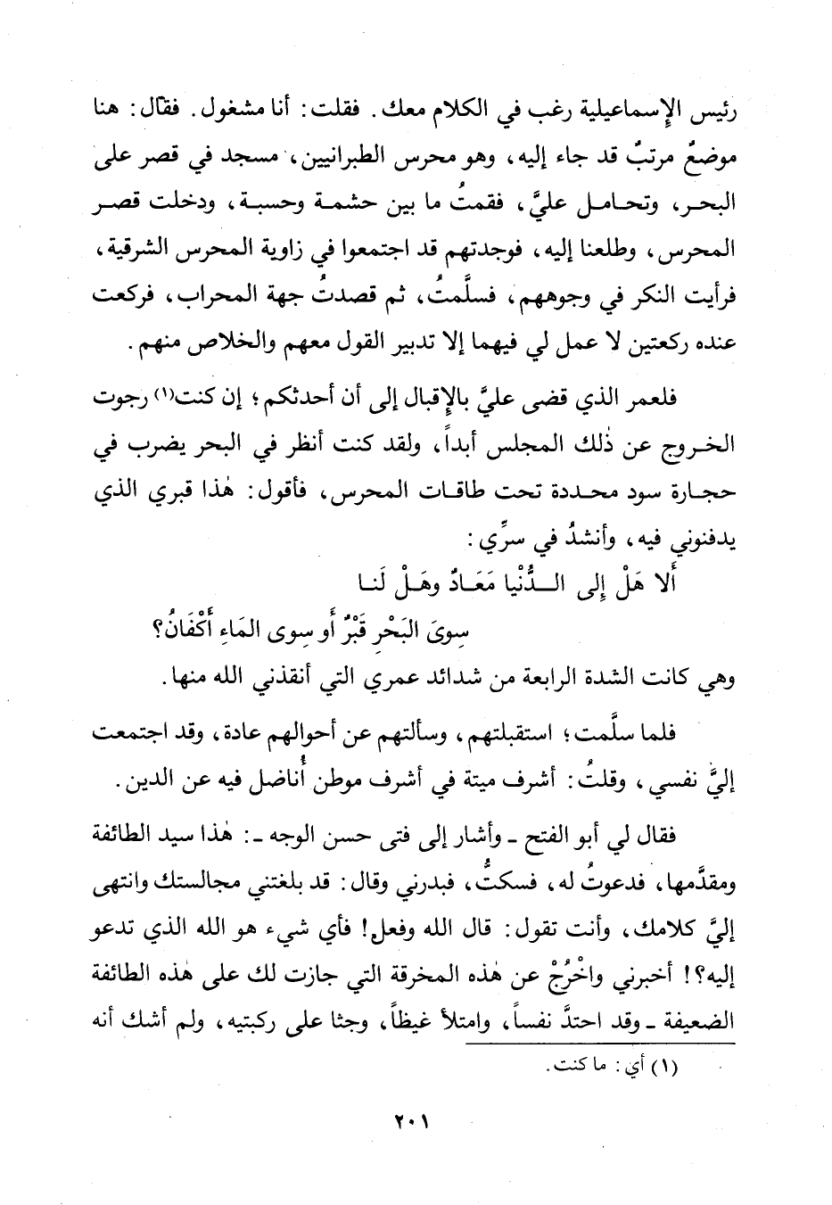 رَئِيسَ الْإِسْمَاعِيلِيَّةِ رَغِبَ فِي الْكَلَامِ مَعَكَ، فَقُلْتُ: أَنَا مَشْغُولٌ. فَقَالَ: هُنَا مَوْضِعٌ مُرَتَّبٌ قَدْ جَاءَ إِلَيْهِ، وَهُوَ مَحْرَسُ الطَّبَرَانِيِّينَ، مَسْجِدٌ فِي قَصْرٍ عَلَى الْبَحْرِ، وَتَحَامَلَ عَلَيَّ، فَقُمْتُ مَا بَيْنَ حِشْمَةٍ وَحِسْبَةٍ، وَدَخَلْتُ قَصْرَ الْمَحْرَسِ، وَطَلَعْنَا إِلَيْهِ، فَوَجَدْتُهُمْ قَدِ اجْتَمَعُوا فِي زَاوِيَةِ الْمَحْرَسِ الشَّرْقِيَّةِ، فَرَأَيْتُ النُّكْرَ فِي وُجُوهِهِمْ، فَسَلَّمْتُ ثُمَّ قَصَدْتُ جِهَةَ الْمِحْرَابِ، فَرَكَعْتُ عِنْدَهُ رَكْعَتَيْنِ لَا عَمَلَ لِي فِيهِمَا إِلَّا تَدْبِيرُ الْقَوْلِ مَعَهُمْ وَالْخَلَاصُ مِنْهُمْ.