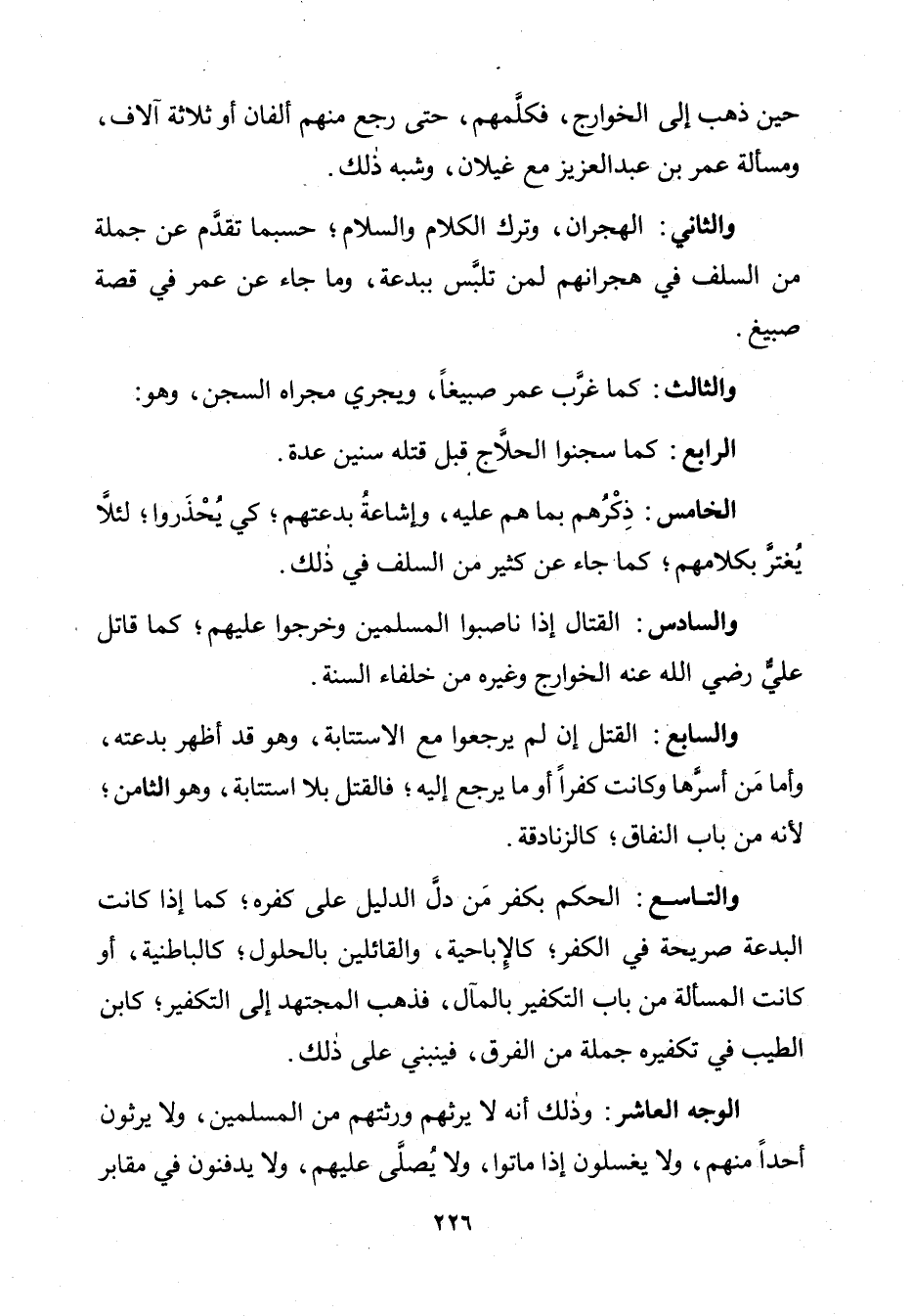 السَّادِسُ: الْقَتْلُ إِذَا نَاصَبُوا الْمُسْلِمِينَ وَخَرَجُوا عَلَيْهِمْ ; كَمَا قَاتَلَ عَلِيٌّ رَضِيَ اللَّهُ عَنْهُ الْخَوَارِجَ وَغَيْرُهُ مِنْ خُلَفَاءِ السُّنَّةِ.