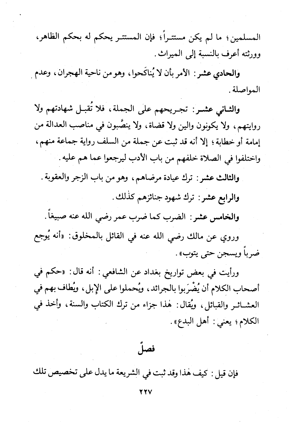 وَرَأَيْتُ فِي بَعْضِ تَوَارِيخِ بَغْدَادَ عَنِ الشَّافِعِيِّ: أَنَّهُ قَالَ: " حُكِمَ فِي أَصْحَابِ الْكَلَامِ أَنْ يُضْرَبُوا بِالْجَرَائِدِ، وَيُحْمَلُوا عَلَى الْإِبِلِ، وَيُطَافَ بِهِمْ فِي الْعَشَائِرِ وَالْقَبَائِلِ، وَيُقَالَ: هَذَا جَزَاءُ مَنْ تَرَكَ الْكِتَابَ وَالسُّنَّةَ، وَأَخَذَ فِي الْكَلَامِ; يَعْنِي: أَهْلَ الْبِدَعِ ".