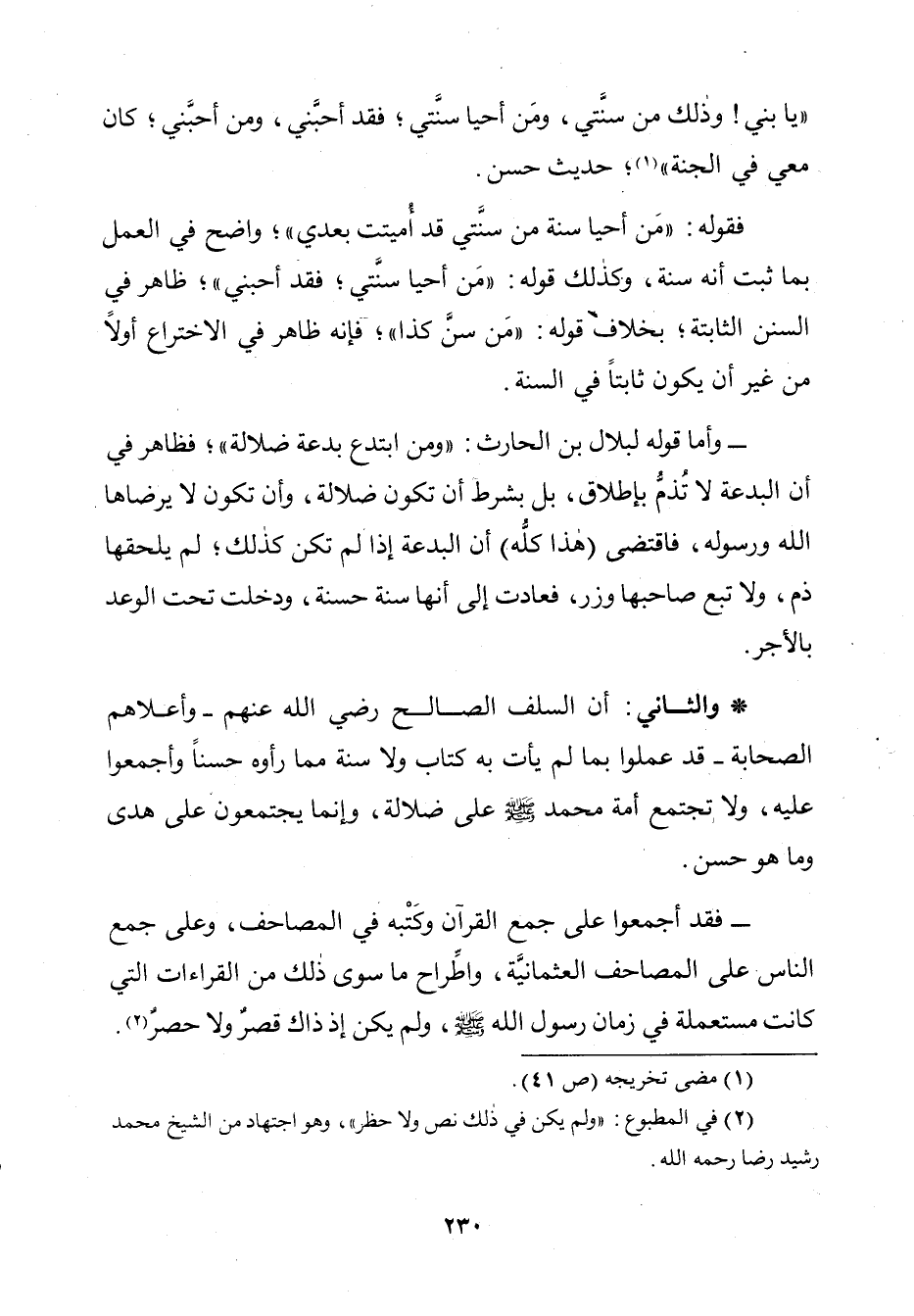 وَالثَّانِي: أَنَّ السَّلَفَ الصَّالِحَ رَضِيَ اللَّهُ عَنْهُمْ وَأَعْلَاهُمُ الصَّحَابَةُ قَدْ عَمِلُوا بِمَا لَمْ يَأْتِ بِهِ كِتَابٌ وَلَا سُنَّةٌ مِمَّا رَأَوْهُ حَسَنًا وَأَجْمَعُوا عَلَيْهِ، وَلَا تَجْتَمِعُ أُمَّةُ مُحَمَّدٍ صَلَّى اللَّهُ عَلَيْهِ وَسَلَّمَ عَلَى ضَلَالَةٍ، وَإِنَّمَا يَجْتَمِعُونَ عَلَى هُدًى وَمَا هُوَ حَسَنٌ.