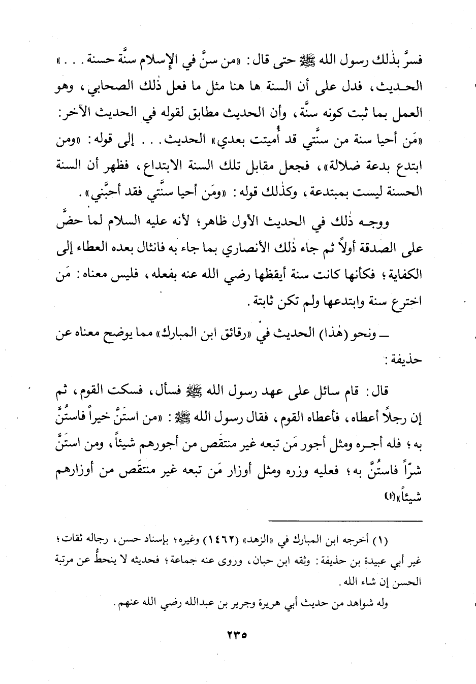 فَسُرَّ بِذَلِكَ رَسُولُ اللَّهِ صَلَّى اللَّهُ عَلَيْهِ وَسَلَّمَ حَتَّى قَالَ: «مَن سَنَّ فِي الْإِسْلَامِ سُنَّةً حَسَنَةً. .». . . الْحَدِيثَ، فَدَلَّ عَلَى أَنَّ السُّنَّةَ هَاهُنَا مِثْلُ مَا فَعَلَ ذَلِكَ الصَّحَابِيُّ، وَهُوَ الْعَمَلُ بِمَا ثَبَتَ كَوْنُهُ سُنَّةً، وَأَنَّ الْحَدِيثَ مُطَابِقٌ لِقَوْلِهِ فِي الْحَدِيثِ الْآخَرِ: «مَنْ أَحْيَا سُنَّةً مِنْ سُنَّتِي قَدْ أُمِيتَتْ بِعْدِي» الْحَدِيثَ إِلَى قَوْلِهِ «وَمَنِ ابْتَدَعَ بِدْعَةً ضَلَالَةً»، فَجَعَلَ مُقَابِلَ تِلْكَ السُّنَّةِ الِابْتِدَاعَ، فَظَهَرَ أَنَّ السُّنَّةَ الْحَسَنَةَ لَيْسَتْ بِمُبْتَدَعَةٍ، وَكَذَلِكَ قَوْلُهُ: «وَمَنْ أَحْيَا سُنَّتِي فَقَدْ أَحَبَّنِي.»