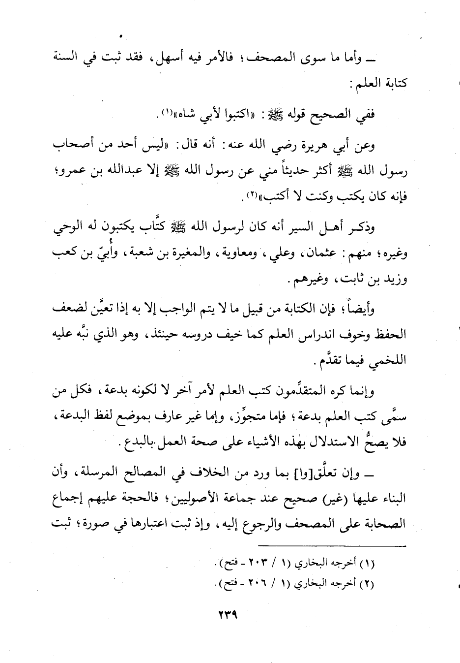وَأَمَّا مَا سِوَى الْمُصْحَفِ; فَالْأَمْرُ فِيهِ أَسْهَلُ، فَقَدْ ثَبَتَ فِي السُّنَّةِ كِتَابَةُ الْعِلْمِ: