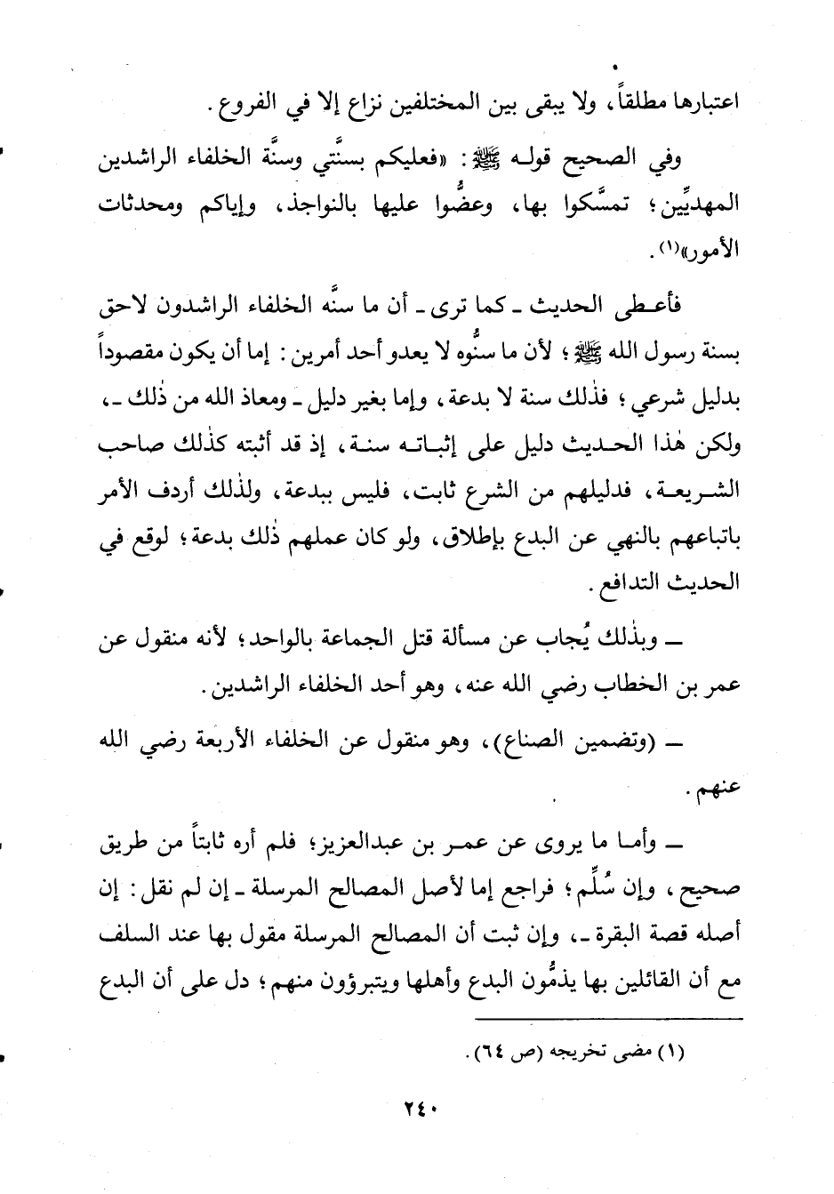 وَفِي الصَّحِيحِ قَوْلُهُ صَلَّى اللَّهُ عَلَيْهِ وَسَلَّمَ: «فَعَلَيْكُمْ بِسُنَّتِي وَسُنَّةِ الْخُلَفَاءِ الرَّاشِدِينَ الْمَهْدِيِّينَ; تَمَسَّكُوا بِهَا، وَعَضُّوا عَلَيْهَا بِالنَّوَاجِذِ، وَإِيَّاكُمْ وَمُحْدَثَاتِ الْأُمُورِ».