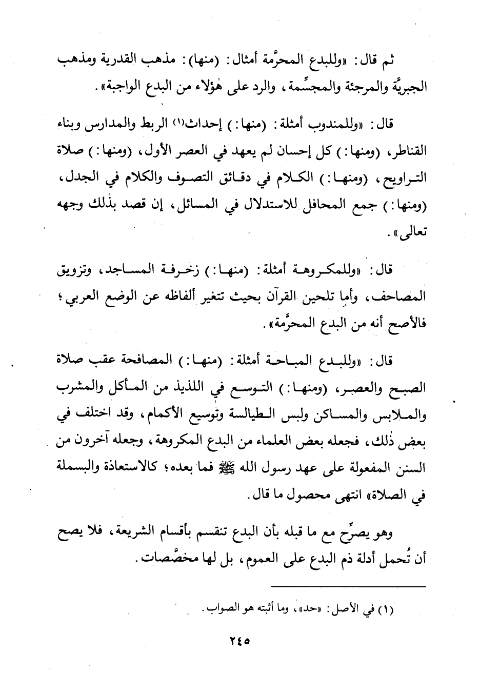 ثُمَّ قَالَ: " وَلِلْبِدَعِ الْمُحَرَّمَةِ أَمْثَالٌ: (مِنْهَا): مَذْهَبُ الْقَدَرِيَّةِ وَمَذْهَبُ الْجَبْرِيَّةِ وَالْمُرْجِئَةِ وَالْمُجَسِّمَةِ، وَالرَّدُّ عَلَى هَؤُلَاءِ مِنَ الْبِدَعِ الْوَاجِبَةِ.