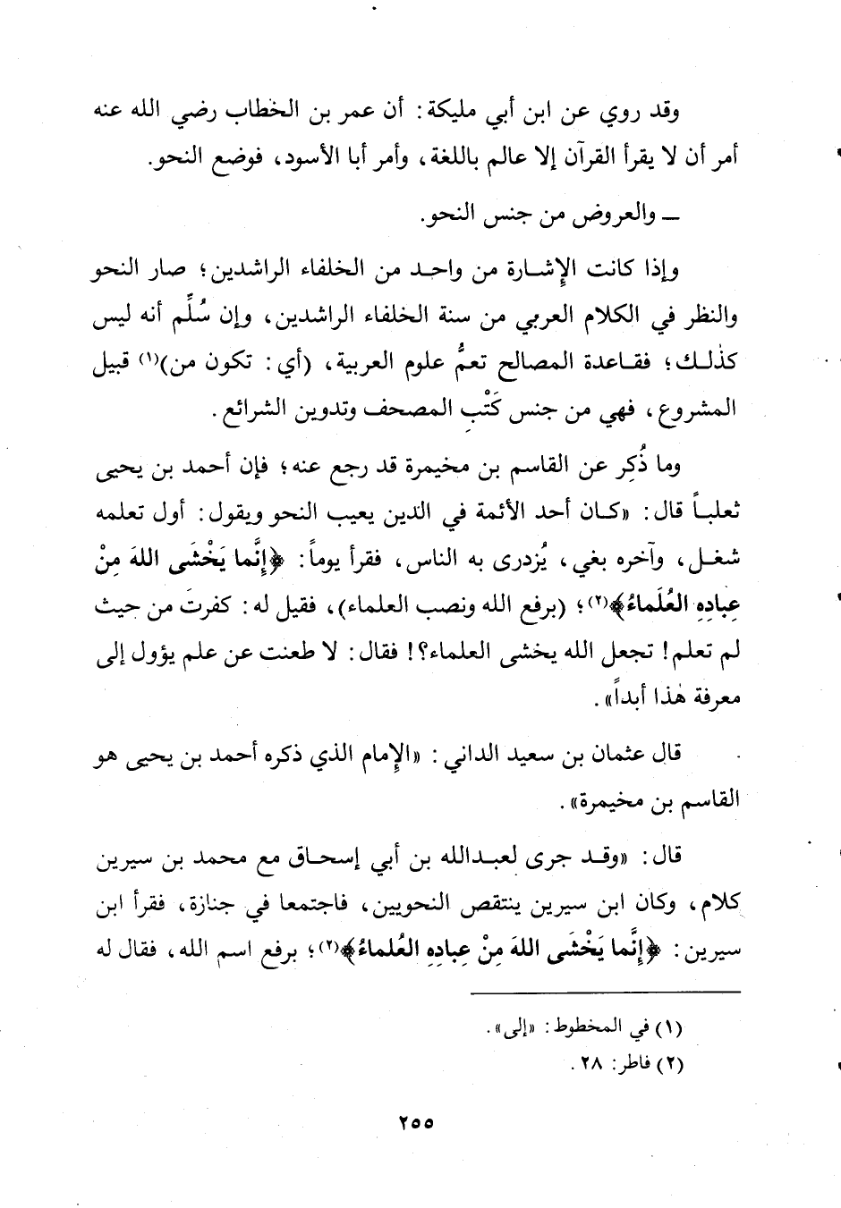 قَالَ: " وَقَدْ جَرَى لِعَبْدِ اللَّهِ بْنِ أَبِي إِسْحَاقَ مَعَ مُحَمَّدِ بْنِ سِيرِينَ كَلَامٌ، وَكَانَ ابْنُ سِيرِينَ يَنْتَقِصُ النَّحْوِيِّينَ، فَاجْتَمَعَا فِي جِنَازَةٍ، فَقَرَأَ ابْنُ سِيرِينَ إِنَّمَا يَخْشَى اللَّهُ مِنْ عِبَادِهِ الْعُلَمَاءَ؛ بِرَفْعِ اسْمِ اللَّهِ، فَقَالَ لَهُ