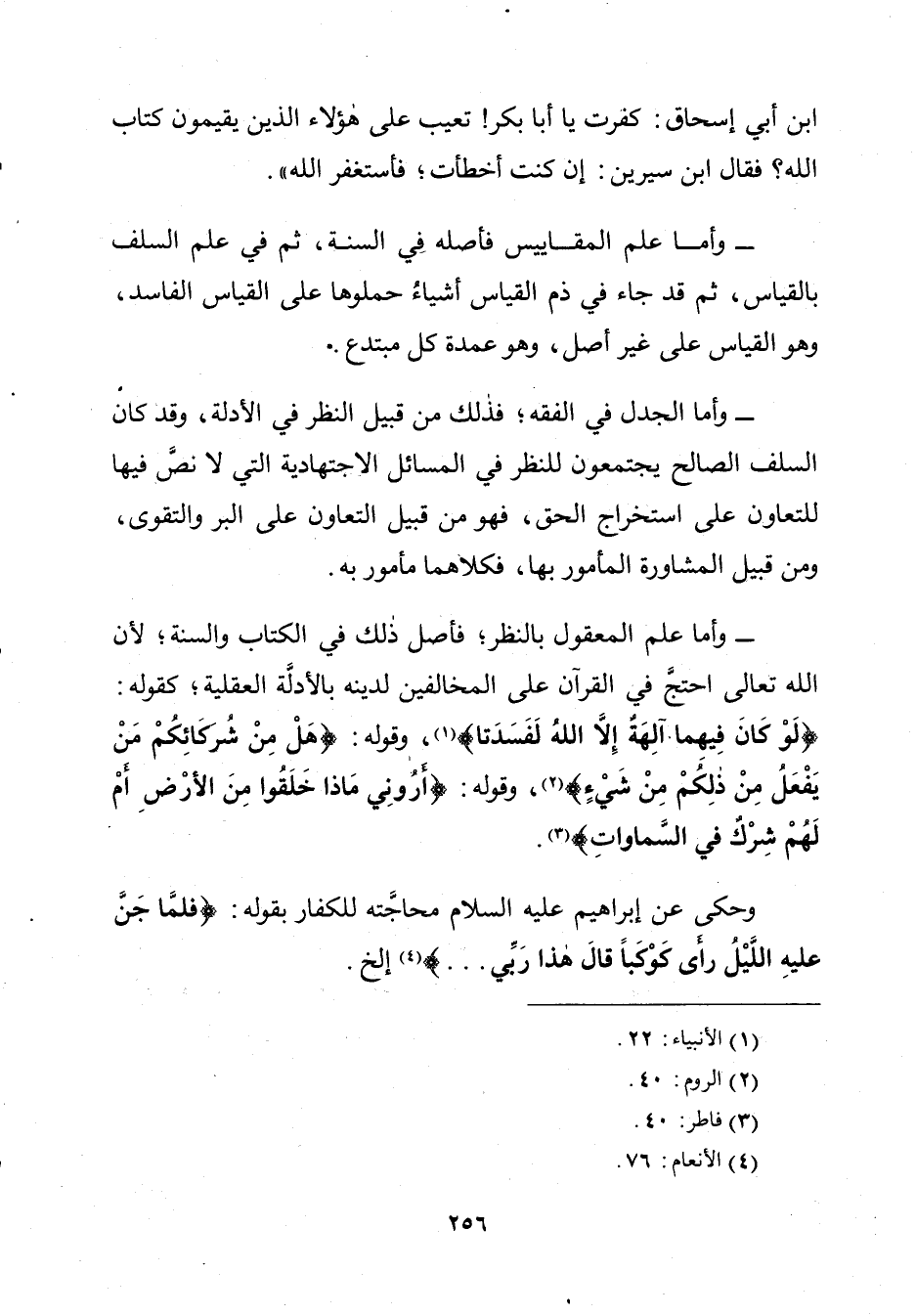 - وَأَمَّا عِلْمُ الْمَعْقُولِ بِالنَّظَرِ؛ فَأَصْلُ ذَلِكَ فِي الْكِتَابِ وَالسُّنَّةِ؛ لِأَنَّ اللَّهَ تَعَالَى احْتَجَّ فِي الْقُرْآنِ عَلَى الْمُخَالِفِينَ لِدِينِهِ بِالْأَدِلَّةِ الْعَقْلِيَّةِ؛ كَقَوْلِهِ: {لَوْ كَانَ فِيهِمَا آلِهَةٌ إِلَّا اللَّهُ لَفَسَدَتَا} [الأنبياء: 22]، وَقَوْلُهُ: {هَلْ مِنْ شُرَكَائِكُمْ مَنْ يَفْعَلُ مِنْ ذَلِكُمْ مِنْ شَيْءٍ} [الروم: 40]، وَقَوْلُهُ: {أَرُونِي مَاذَا خَلَقُوا مِنَ الْأَرْضِ أَمْ لَهُمْ شِرْكٌ فِي السَّمَاوَاتِ} [فاطر: 40]