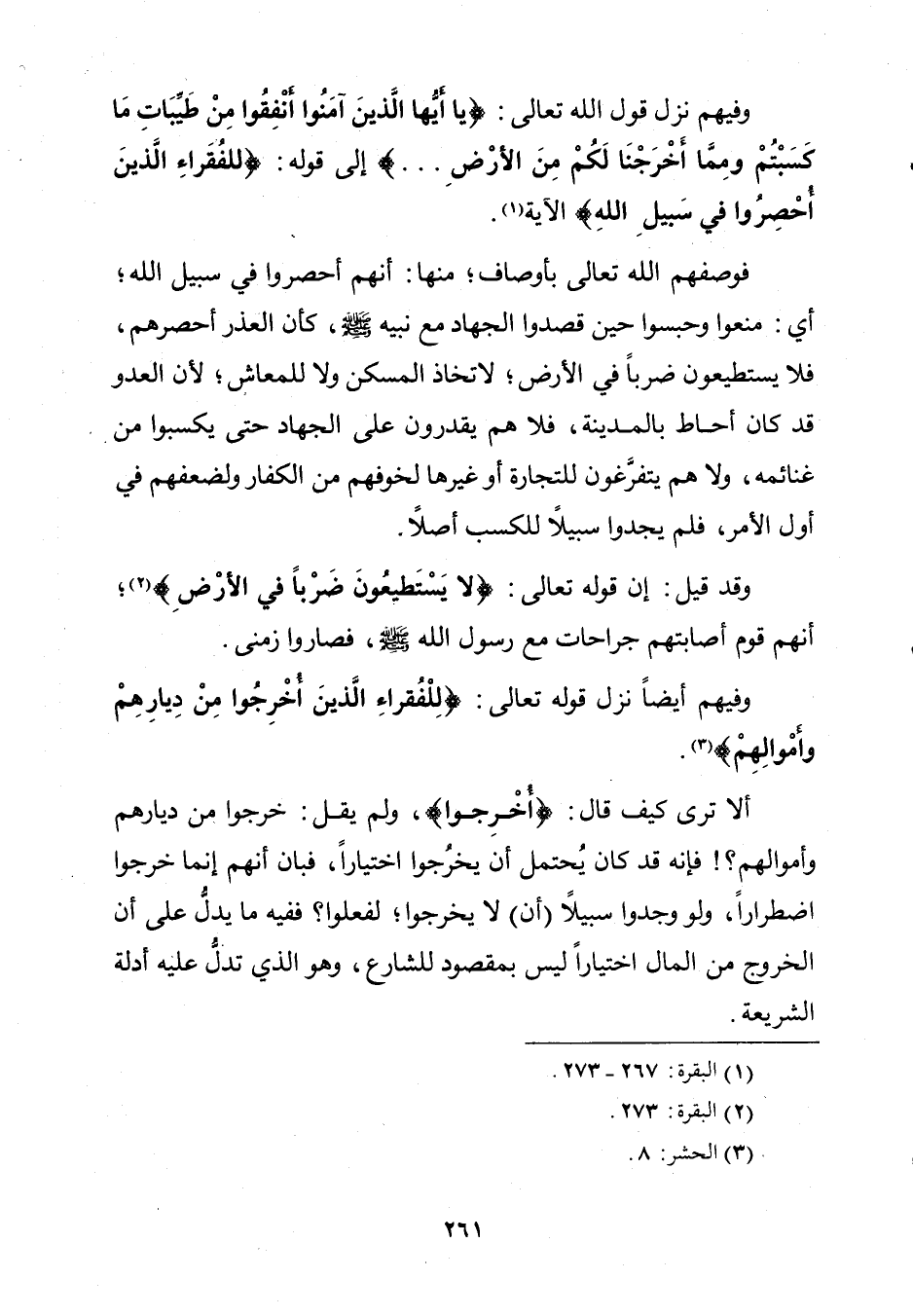 فَوَصَفَهُمُ اللَّهُ تَعَالَى بِأَوْصَافٍ؛ مِنْهَا: أَنَّهُمْ أَحُصِرُوا فِي سَبِيلِ اللَّهِ؛ أَيْ: مُنِعُوا وَحُبِسُوا حِينَ قَصَدُوا الْجِهَادَ مَعَ نَبِيِّهِ صَلَّى اللَّهُ عَلَيْهِ وَسَلَّمَ، كَأَنَّ الْعُذْرَ أَحْصَرَهُمْ، فَلَا يَسْتَطِيعُونَ ضَرْبًا فِي الْأَرْضِ؛ لِاتِّخَاذِ الْمَسْكَنِ وَلَا لِلْمَعَاشِ؛ لِأَنَّ الْعَدُوَّ قَدْ كَانَ أَحَاطَ بِالْمَدِينَةِ، فَلَا هُمْ يَقْدِرُونَ عَلَى الْجِهَادِ حَتَّى يَكْسِبُوا مِنْ غَنَائِمِهِ، وَلَا هُمْ يَتَفَرَّغُونَ لِلتِّجَارَةِ أَوْ غَيْرِهَا لِخَوْفِهِمْ مِنَ الْكُفَّارِ وَلِضَعْفِهِمْ فِي أَوَّلِ الْأَمْرِ، فَلَمْ يَجِدُوا سَبِيلًا لِلْكَسْبِ أَصْلًا.