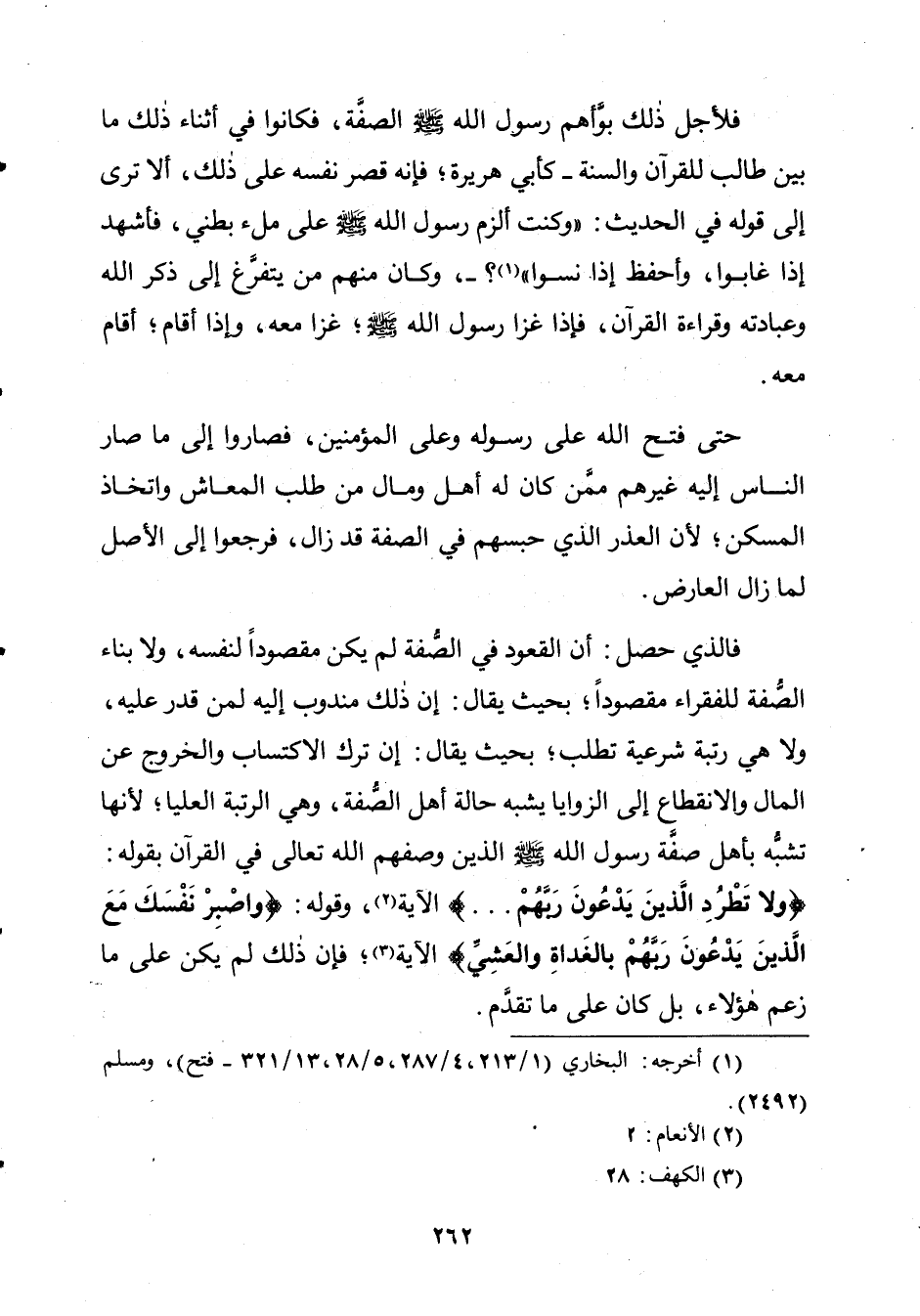 فَلِأَجْلٍ ذَلِكَ بَوَّأَهُمْ رَسُولُ اللَّهِ صَلَّى اللَّهُ عَلَيْهِ وَسَلَّمَ الصُّفَّةَ، فَكَانُوا فِي أَثْنَاءِ ذَلِكَ مَا بَيْنَ طَالِبٍ لِلْقُرْآنِ وَالسُّنَّةِ - كَأَبِي هُرَيْرَةَ؛ فَإِنَّهُ قَصَرَ نَفْسَهُ عَلَى ذَلِكَ، أَلَا تَرَى إِلَى قَوْلِهِ فِي الْحَدِيثِ: " وَكُنْتُ أَلْزَمُ رَسُولَ اللَّهِ صَلَّى اللَّهُ عَلَيْهِ وَسَلَّمَ عَلَى مِلْءِ بَطْنِي، فَأَشْهَدُ إِذَا غَابُوا، وَأَحْفَظُ إِذَا نَسُوا؟ -، وَكَانَ مِنْهُمْ مَنْ يَتَفَرَّغُ إِلَى ذِكْرِ اللَّهِ وَعِبَادَتِهِ وَقِرَاءَةِ الْقُرْآنِ، فَإِذَا غَزَا رَسُولُ اللَّهِ صَلَّى اللَّهُ عَلَيْهِ وَسَلَّمَ؟ غَزَا مَعَهُ، وَإِذَا أَقَامَ؛ أَقَامَ مَعَهُ.