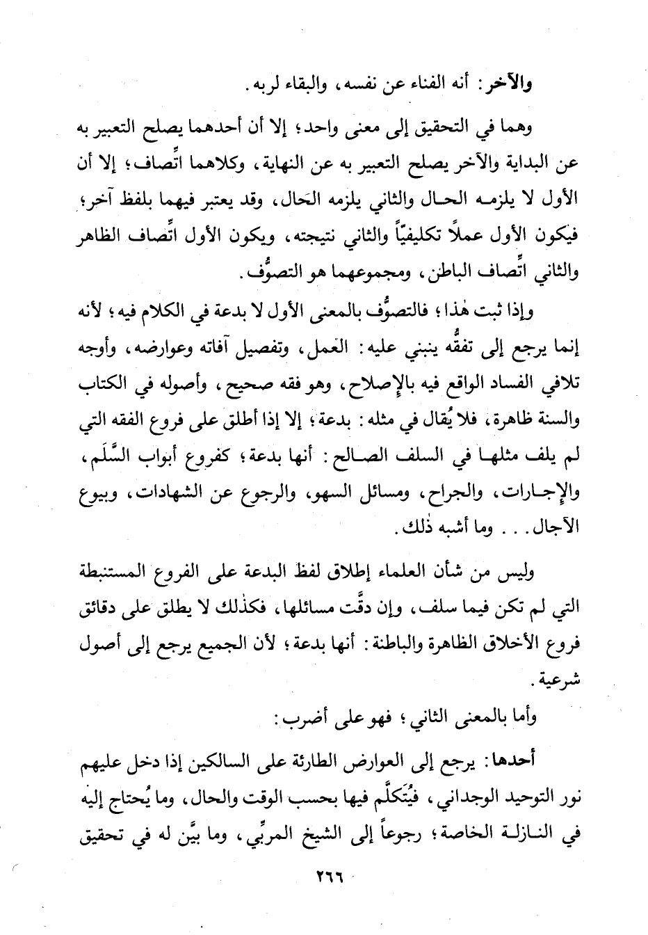 وَإِذَا ثَبَتَ هَذَا؛ فَالتَّصَوُّفُ بِالْمَعْنَى الْأَوَّلِ لَا بِدْعَةَ فِي الْكَلَامِ فِيهِ؛ لِأَنَّهُ إِنَّمَا يَرْجِعُ إِلَى تَفَقُّهٍ يَنْبَنِي عَلَيْهِ: الْعَمَلُ، وَتَفْصِيلُ آفَاتِهِ وَعَوَارِضِهِ، وَأَوْجُهِ تَلَافِي الْفَسَادِ الْوَاقِعِ فِيهِ بِالْإِصْلَاحِ، وَهُوَ فِقْهٌ صَحِيحٌ، وَأُصُولُهُ فِي الْكِتَابِ وَالسُّنَّةِ ظَاهِرَةٌ، فَلَا يُقَالُ فِي مَثَلِهِ: بِدْعَةٌ؛ إِلَّا إِذَا أَطْلَقَ عَلَى فُرُوعِ الْفِقْهِ الَّتِي لَمْ يُلْفَ مِثْلُهَا فِي السَّلَفِ الصَّالِحِ: أَنَّهَا بِدْعَةٌ؛ كَفُرُوعِ أَبْوَابِ السَّلَمِ، وَالْإِجَارَاتِ، وَالْجِرَاحِ، وَمَسَائِلِ السَّهْوِ، وَالرُّجُوعِ عَنِ الشَّهَادَاتِ، وَبُيُوعِ الْآجَالِ. . . . وَمَا أَشْبَهَ ذَلِكَ.