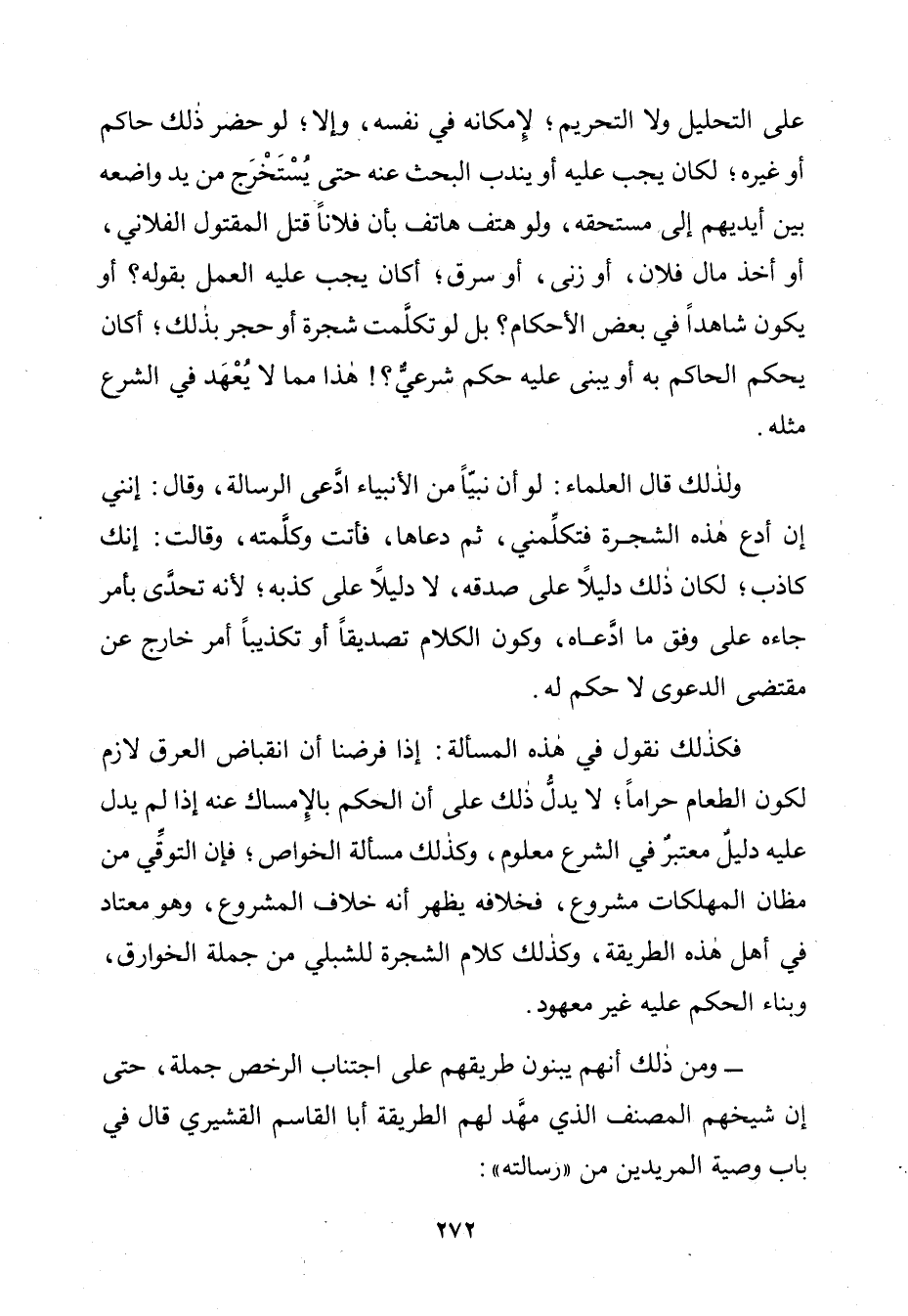 فَكَذَلِكَ نَقُولُ فِي هَذِهِ الْمَسْأَلَةِ: إِذَا فَرَضْنَا أَنَّ انْقِبَاضَ الْعِرْقِ لَازِمٌ لِكَوْنِ الطَّعَامِ حَرَامًا؛ لَا يَدُلُّ ذَلِكَ عَلَى أَنَّ الْحُكْمَ بِالْإِمْسَاكِ عَنْهُ إِذَا لَمْ يَدُلُّ عَلَيْهِ دَلِيلٌ مُعْتَبَرٌ فِي الشَّرْعِ مَعْلُومٌ، فَكَذَلِكَ مَسْأَلَةُ الْخَوَاصِّ؛ فَإِنَّ التَّوَقِّيَ مِنْ مَظَانِّ الْمُهْلِكَاتِ مَشْرُوعٌ، فَخِلَافُهُ يَظْهَرُ أَنَّهُ خِلَافُ الْمَشْرُوعِ، وَهُوَ مُعْتَادٌ فِي أَهْلِ هَذِهِ الطَّرِيقَةِ، وَكَذَلِكَ كَلَامُ الشَّجَرَةِ لِلشِّبْلِيِّ مِنْ جُمْلَةِ الْخَوَارِقِ، وَبِنَاءَ الْحُكْمِ عَلَيْهِ غَيْرُ مَعْهُودٍ.