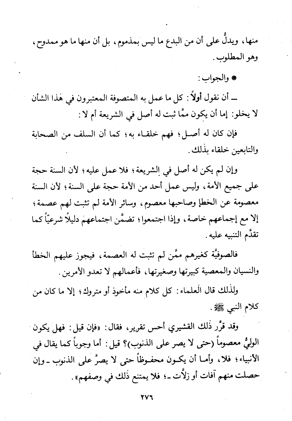 - أَنْ نَقُولَ أَوَّلًا: كُلُّ مَا عَمِلَ بِهِ الْمُتَصَوِّفَةُ الْمُعْتَبَرُونَ فِي هَذَا الشَّأْنِ لَا يَخْلُو: إِمَّا أَنْ يَكُونَ مِمَّا ثَبَتَ لَهُ أَصْلٌ فِي الشَّرِيعَةِ أَمْ لَا: