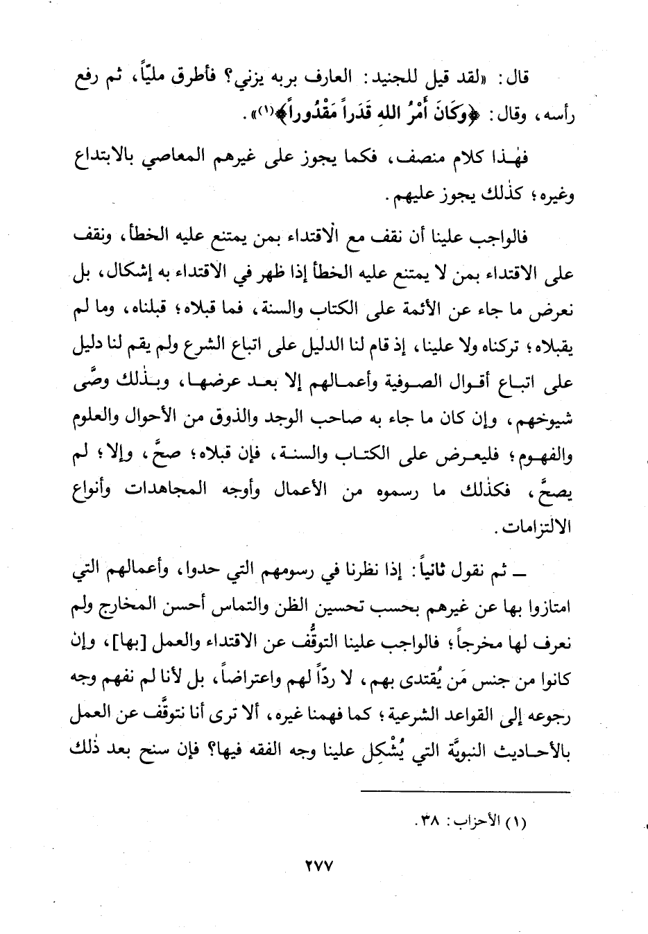 قَالَ: " لَقَدْ قِيلَ لِلْجُنَيْدِ: الْعَارِفُ بِرَبِّهِ يَزْنِي؟ فَأَطْرَقَ مَلِيًّا، ثُمَّ رَفَعَ رَأْسَهُ، وَقَالَ: وَكَانَ أَمْرُ اللَّهِ قَدَرًا مَقْدُورًا.