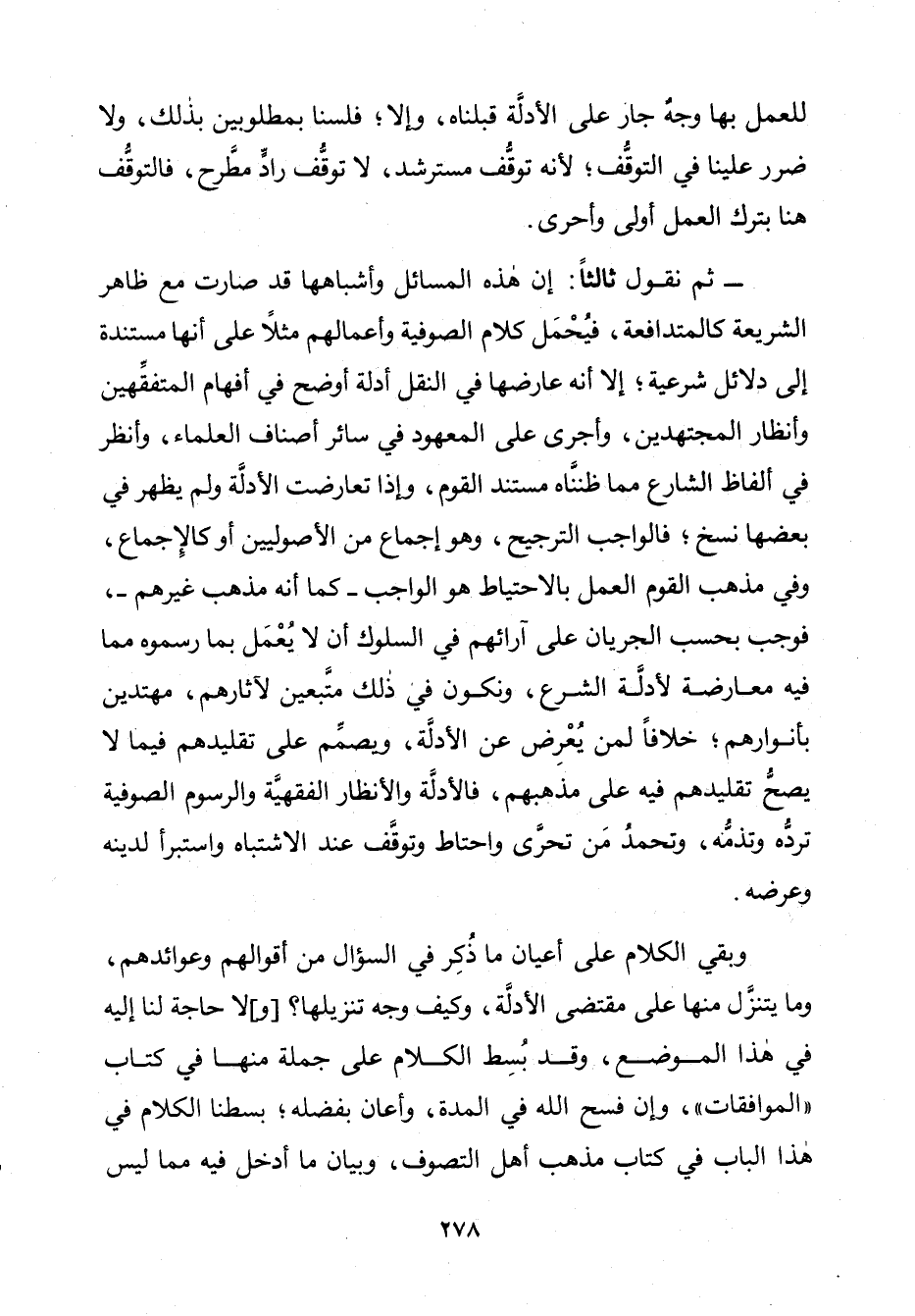 ثُمَّ نَقُولُ ثَالِثًا: إِنَّ هَذِهِ الْمَسَائِلَ وَأَشْبَاهَهَا قَدْ صَارَتْ مَعَ ظَاهِرِ الشَّرِيعَةِ كَالْمُتَدَافِعَةِ، فَيُحْمَلُ كَلَامُ الصُّوفِيَّةِ وَأَعْمَالُهُمْ مَثَلًا عَلَى أَنَّهَا مُسْتَنِدَةٌ إِلَى دَلَائِلَ شَرْعِيَّةٍ؛ إِلَّا أَنَّهُ عَارَضَهَا فِي النَّقْلِ أَدِلَّةٌ أَوْضَحُ فِي أَفْهَامِ الْمُتَفَقِّهِينَ وَأَنْظَارِ الْمُجْتَهِدِينَ، وَأَجْرَى عَلَى الْمَعْهُودِ فِي سَائِرِ أَصْنَافِ الْعُلَمَاءِ، وَأَنْظُرُ فِي أَلْفَاظِ الشَّارِعِ مِمَّا ظَنَنَّاهُ مُسْتَنَدَ الْقَوْمِ، وَإِذَا تَعَارَضَتِ الْأَدِلَّةُ وَلَمْ يَظْهَرْ فِي بَعْضِهَا نَسْخٌ؛ فَالْوَاجِبُ التَّرْجِيحُ، وَهُوَ إِجْمَاعٌ مِنَ الْأُصُولِيِّينَ أَوْ كَالْإِجْمَاعِ، وَفِي مَذْهَبِ الْقَوْمِ الْعَمَلُ بِالِاحْتِيَاطِ هُوَ الْوَاجِبُ - كَمَا أَنَّهُ مَذْهَبُ غَيْرِهِمْ -، فَوَجَبَ بِحَسْبَ الْجَرَيَانِ عَلَى آرَائِهِمْ فِي السُّلُوكِ أَنْ لَا يُعْمَلَ بِمَا رَسَمُوهُ مِمَّا فِيهِ مُعَارَضَةٌ لِأَدِلَّةِ الشَّرْعِ، وَنَكُونُ فِي ذَلِكَ مُتَّبِعِينَ لِآثَارِهِمْ، مُهْتَدِينَ بِأَنْوَارِهِمْ؛ خِلَافًا لِمَنْ يُعْرِضُ عَنِ الْأَدِلَّةِ، وَيُصَمِّمُ عَلَى تَقْلِيدِهِمْ فِيمَا لَا يَصِحُّ تَقْلِيدُهُمْ فِيهِ عَلَى مَذْهَبِهِمْ، فَالْأَدِلَّةُ وَالْأَنْظَارُ الْفِقْهِيَّةُ وَالرُّسُومُ الصُّوفِيَّةُ تَرُدُّهُ وَتَذُمُّهُ، وَتَحْمَدُ مَنْ تَحَرَّى وَاحْتَاطَ وَتَوَقَّفَ عِنْدَ الِاشْتِبَاهِ وَاسْتَبْرَأَ لِدِينِهِ وَعِرْضِهِ.