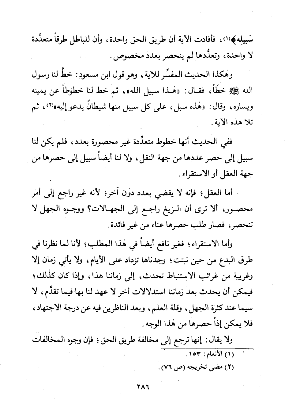 فَأَفَادَتِ الْآيَةُ أَنَّ طَرِيقَ الْحَقِّ وَاحِدَةٌ، وَأَنَّ لِلْبَاطِلِ طُرُقًا مُتَعَدِّدَةً لَا وَاحِدَةً، وَتَعَدُّدُهَا لَمْ يُحْصَ بِعَدَدٍ مَخْصُوصٍ.