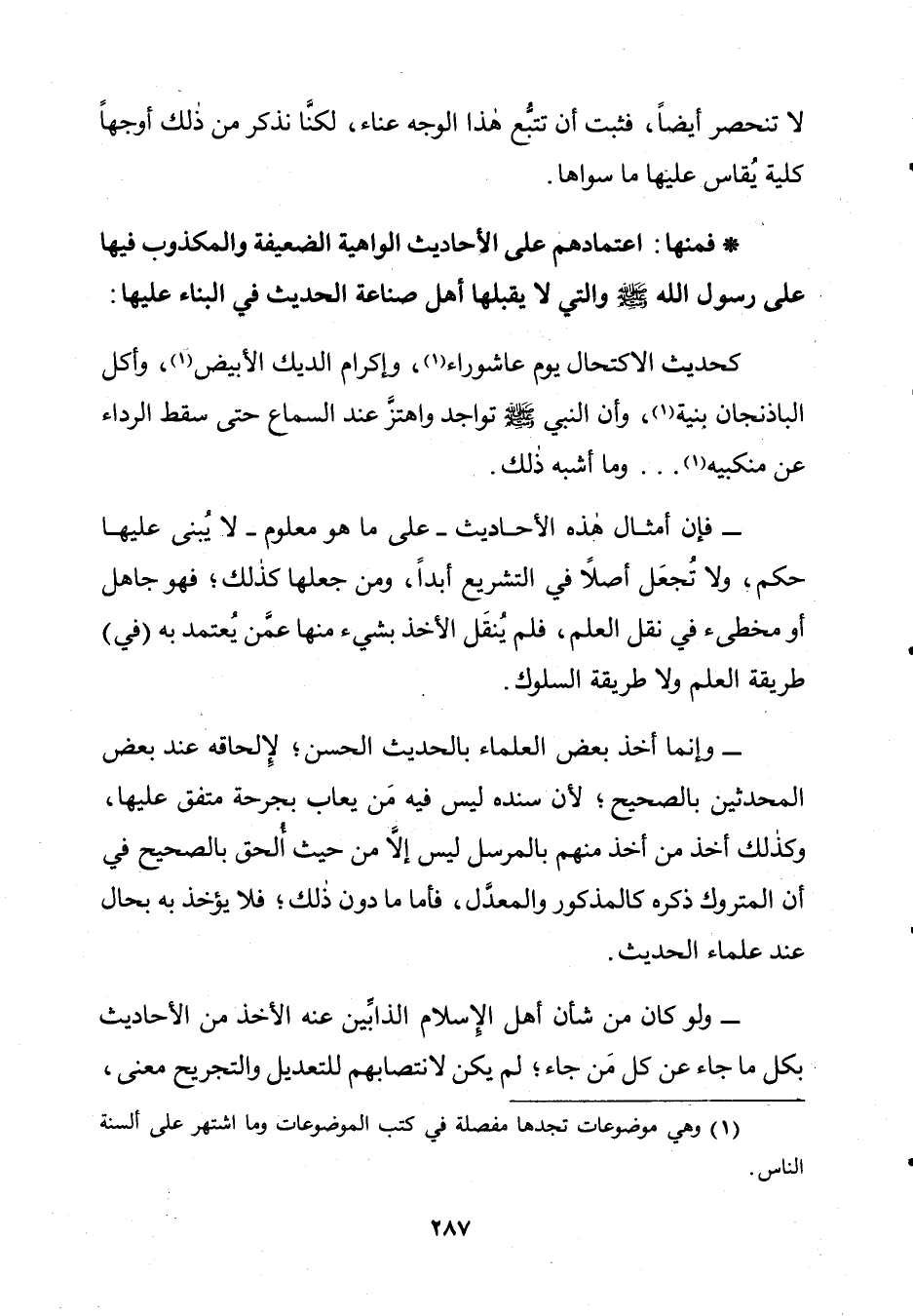 كَحَدِيثِ الِاكْتِحَالِ يَوْمَ عَاشُورَاءَ، وَإِكْرَامِ الدِّيكِ الْأَبْيَضِ، وَأَكْلِ الْبَاذِنْجَانِ بِنْيَةٍ، وَأَنَّ النَّبِيَّ صَلَّى اللَّهُ عَلَيْهِ وَسَلَّمَ تَوَاجَدَ وَاهْتَزَّ عِنْدَ السَّمَاعِ حَتَّى سَقَطَ الرِّدَاءُ عَنْ مَنْكِبَيْهِ. . . وَمَا أَشْبَهَ ذَلِكَ.