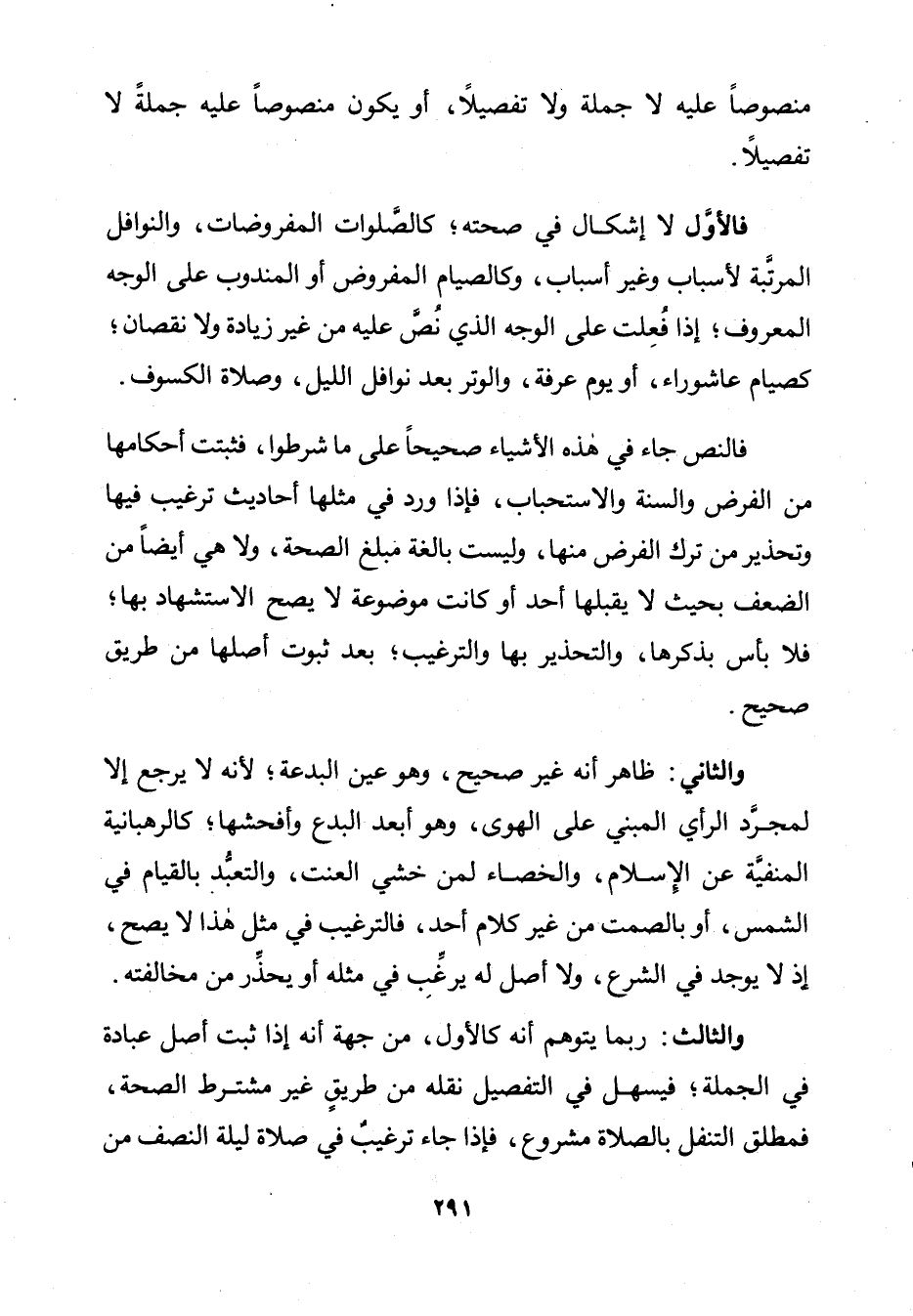وَالثَّانِي: ظَاهِرٌ أَنَّهُ غَيْرُ صَحِيحٍ، وَهُوَ عَيْنُ الْبِدْعَةِ؛ لِأَنَّهُ لَا يَرْجِعُ إِلَّا لِمُجَرَّدِ الرَّأْيِ الْمَبْنِيِّ عَلَى الْهَوَى، وَهُوَ أَبْدَعُ الْبِدَعِ وَأَفْحَشُهَا؛ كَالرَّهْبَانِيَّةِ الْمَنْفِيَّةِ عَنِ الْإِسْلَامِ، وَالْخِصَاءِ لِمَنْ خَشِيَ الْعَنَتَ، وَالتَّعَبُّدِ بِالْقِيَامِ فِي الشَّمْسِ، أَوْ بِالصَّمْتِ مِنْ غَيْرِ كَلَامِ أَحَدٍ، فَالتَّرْغِيبُ فِي مِثْلِ هَذَا لَا يَصِحُّ، إِذْ لَا يُوجَدُ فِي الشَّرْعِ، وَلَا أَصْلَ لَهُ يُرَغِّبُ فِي مِثْلِهِ، أَوْ يُحَذِّرُ مِنْ مُخَالَفَتِهِ.
