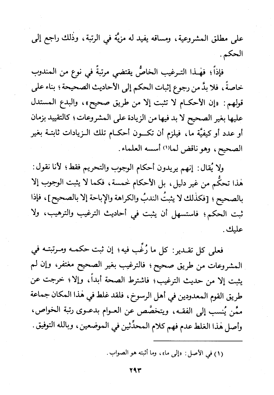 فَعَلَى كُلِّ تَقْدِيرٍ: كُلُّ مَا رَغِبَ فِيهِ؛ إِنْ ثَبَتَ حُكْمُهُ وَمَرْتَبَتُهُ فِي الْمَشْرُوعَاتِ مِنْ طَرِيقٍ صَحِيحٍ؛ فَالتَّرْغِيبُ فِيهِ بِغَيْرِ الصَّحِيحِ مُغْتَفَرٌ، وَإِنْ لَمْ يَثْبُتْ إِلَّا مِنْ حَدِيثِ التَّرْغِيبِ؛ فَاشْتَرِطِ الصِّحَّةَ أَبَدًا، وَإِلَّا؛ خَرَجْتَ عَنْ طَرِيقِ الْقَوْمِ الْمَعْدُودِينَ فِي أَهْلِ الرُّسُوخِ، فَلَقَدْ غَلِطَ فِي الْمَكَانِ جَمَاعَةٌ مِمَّنْ يُنْسَبُ إِلَى الْفِقْهِ، وَيَتَخَصَّصُ عَنِ الْعَوَامِّ بِدَعْوَى رُتْبَةِ الْخَوَاصِّ، وَأَصْلُ هَذَا الْغَلَطِ عَدَمُ فَهْمِ كَلَامِ الْمُحَدِّثِينَ فِي الْمَوْضِعَيْنِ، وَبِاللَّهِ التَّوْفِيقُ.