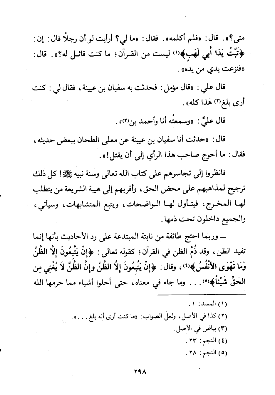 وَرُبَّمَا احْتَجَّ طَائِفَةٌ مِنْ نَابِتَةِ الْمُبْتَدَعَةِ عَلَى رَدِّ الْأَحَادِيثِ بِأَنَّهَا إِنَّمَا تُفِيدُ الظَّنَّ، وَقَدْ ذُمَّ الظَّنُّ فِي الْقُرْآنِ؛ كَقَوْلِهِ تَعَالَى: {إِنْ يَتَّبِعُونَ إِلَّا الظَّنَّ وَمَا تَهْوَى الْأَنْفُسُ} [النجم: 23]، وَقَالَ: {إِنْ يَتَّبِعُونَ إِلَّا الظَّنَّ وَإِنَّ الظَّنَّ لَا يُغْنِي مِنَ الْحَقِّ شَيْئًا} [النجم: 28]،. . . . . وَمَا جَاءَ فِي مَعْنَاهُ، حَتَّى أَحَلُّوا أَشْيَاءَ مِمَّا حَرَمَهَا اللَّهُ