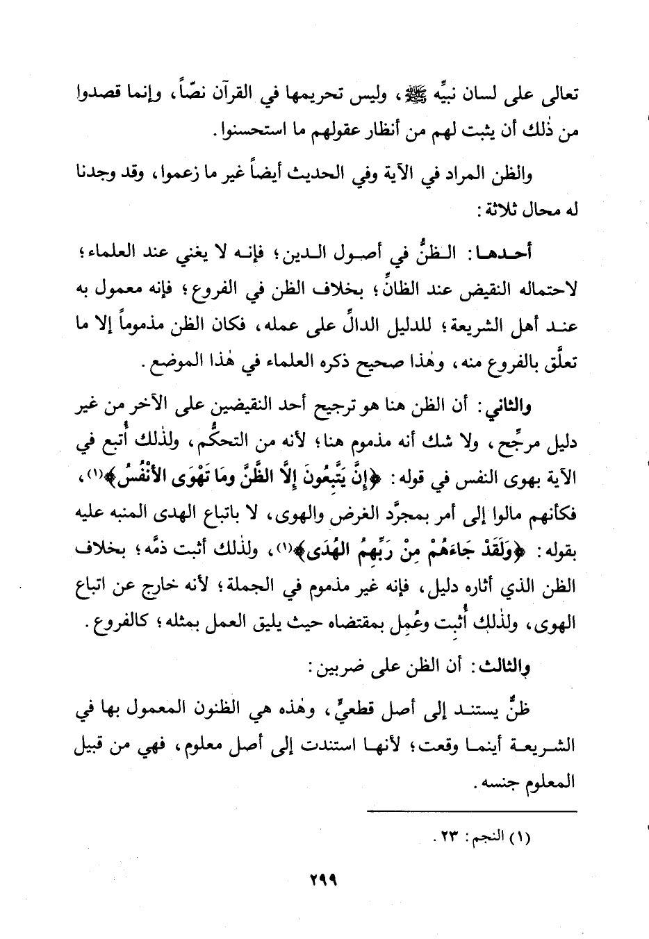 وَالثَّانِي: أَنَّ الظَّنَّ هُنَا هُوَ تَرْجِيحُ أَحَدِ النَّقِيضَيْنِ عَلَى الْآخَرِ مِنْ غَيْرِ دَلِيلٍ مُرَجِّحٍ، وَلَا شَكَّ أَنَّهُ مَذْمُومٌ هُنَا؛ لِأَنَّهُ مِنَ التَّحَكُّمِ، وَلِذَلِكَ أُتْبِعَ فِي الْآيَةِ بِهَوَى النَّفْسِ فِي قَوْلِهِ: إِنْ يَتَّبِعُونَ إِلَّا الظَّنَّ وَمَا تَهْوَى الْأَنْفُسُ فَكَأَنَّهُمْ مَالُوا إِلَى أَمْرٍ بِمُجَرَّدِ الْغَرَضِ وَالْهَوَى، لَا بِاتِّبَاعِ الْهُدَى الْمُنَبِّهِ عَلَيْهِ بِقَوْلِهِ: {وَلَقَدْ جَاءَهُمْ مِنْ رَبِّهِمُ الْهُدَى} [النجم: 23]، وَلِذَلِكَ أَثْبَتَ ذَمَّهُ؛ بِخِلَافِ الظَّنِّ الَّذِي أَثَارَهُ دَلِيلٌ، فَإِنَّهُ غَيْرُ مَذْمُومٍ فِي الْجُمْلَةِ؛ لِأَنَّهُ خَارِجٌ عَنِ اتِّبَاعِ الْهَوَى، وَلِذَلِكَ أُثْبِتَ وَعَمِلَ بِمُقْتَضَاهُ حَيْثُ يَلِيقُ الْعَمَلُ بِمِثْلِهِ؛ كَالْفُرُوعِ.