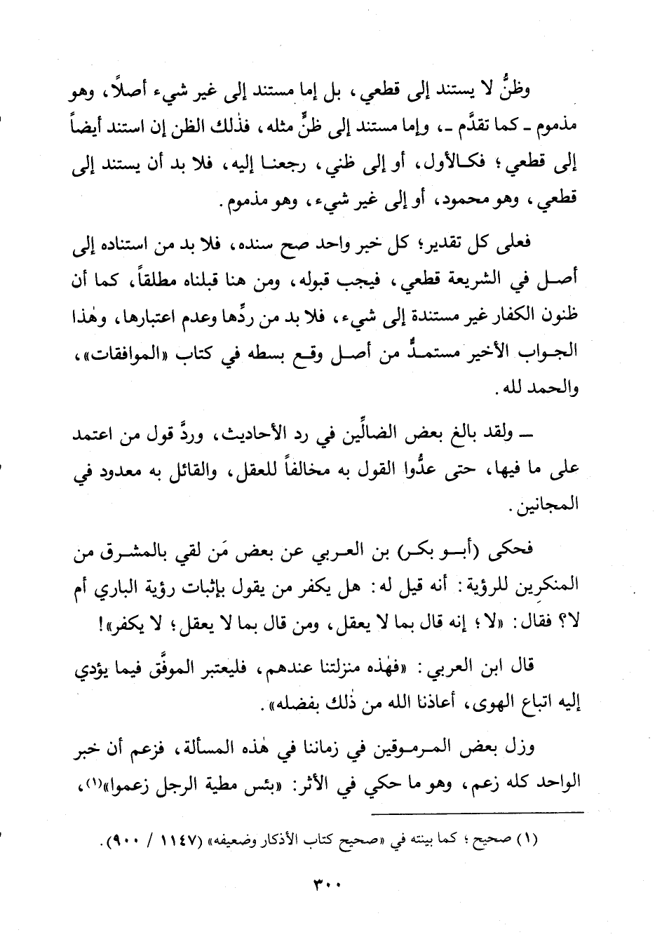 وَلَقَدْ بَالَغَ بَعْضُ الضَّالِّينَ فِي رَدِّ الْأَحَادِيثِ، وَرَدِّ قَوْلِ مَنِ اعْتَمَدَ عَلَى مَا فِيهَا، حَتَّى عَدُّوا الْقَوْلَ بِهِ مُخَالِفًا لِلْعَقْلِ، وَالْقَائِلَ بِهِ مَعْدُودًا فِي الْمَجَانِينِ.