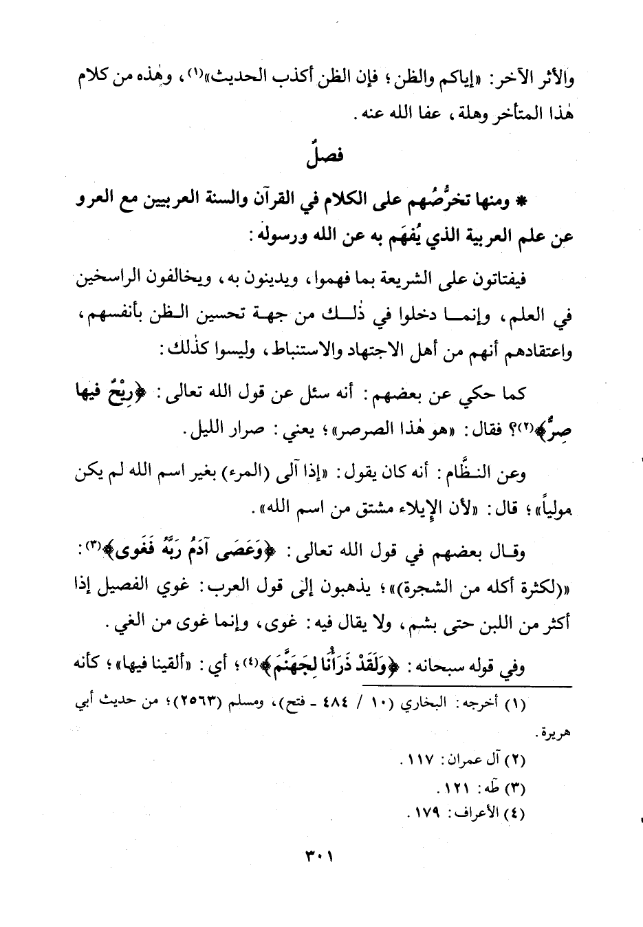 وَمِنْهَا: تَخَرُّصُهُمْ عَلَى الْكَلَامِ فِي الْقُرْآنِ وَالسُّنَّةِ الْعَرَبِيَّيْنِ مَعَ الْعُرُوِّ عَنْ عِلْمِ الْعَرَبِيَّةِ الَّذِي يُفْهَمُ بِهِ عَنِ اللَّهِ وَرَسُولِهِ: