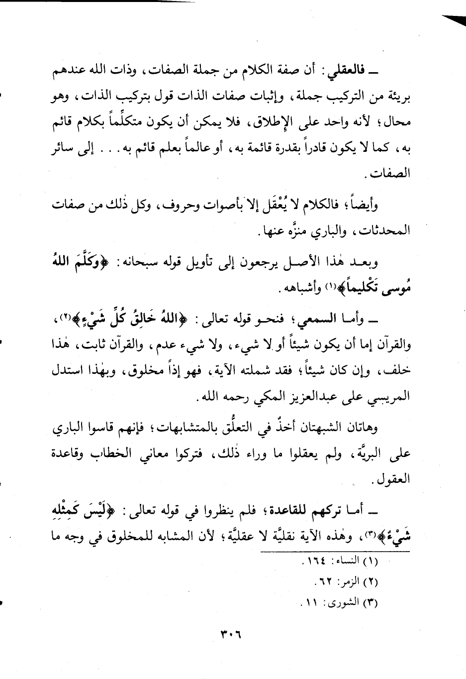 أَمَّا تَرْكُهُمْ لِلْقَاعِدَةِ؛ فَلَمْ يَنْظُرُوا فِي قَوْلِهِ تَعَالَى: {لَيْسَ كَمِثْلِهِ شَيْءٌ} [الشورى: 11]، وَهَذِهِ الْآيَةُ نَقْلِيَّةٌ لَا عَقْلِيَّةٌ؛ لِأَنَّ الْمُشَابِهَ لِلْمَخْلُوقِ فِي وَجْهٍ مَا