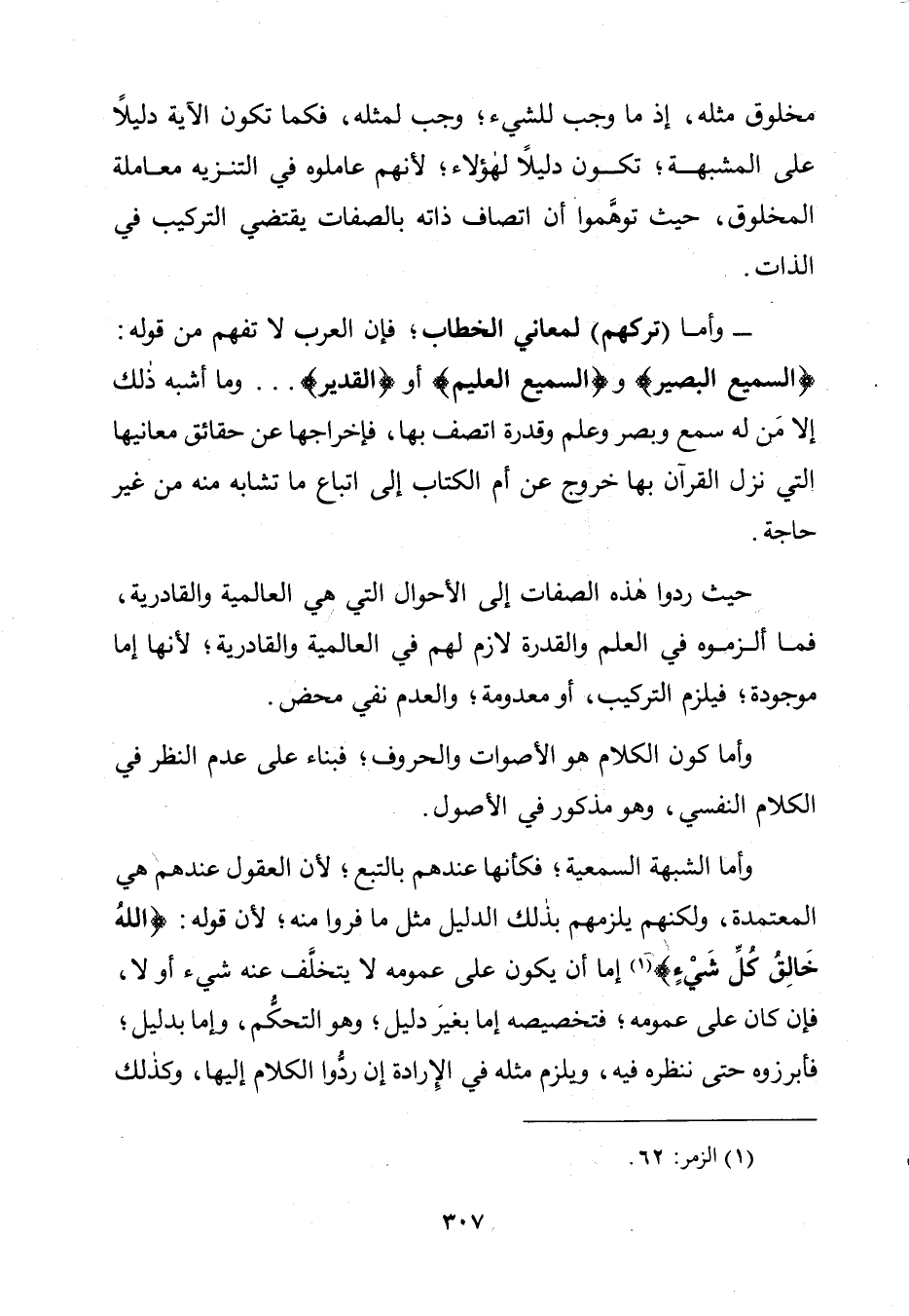 مَخْلُوقٌ مِثْلُهُ، إِذْ مَا وَجَبَ لِلشَّيْءِ؛ وَجَبَ لِمَثْلِهِ، فَكَمَا تَكُونُ الْآيَةُ دَلِيلًا عَلَى الْمُشَبِّهَةِ؛ تَكُونُ دَلِيلًا لِهَؤُلَاءِ؛ لِأَنَّهُمْ عَامَلُوهُ فِي التَّنْزِيهِ مُعَامَلَةَ الْمَخْلُوقِ، حَيْثُ تَوَهَّمُوا أَنَّ اتِّصَافَ ذَاتِهِ بِالصِّفَاتِ يَقْتَضِي التَّرْكِيبَ فِي الذَّاتِ.