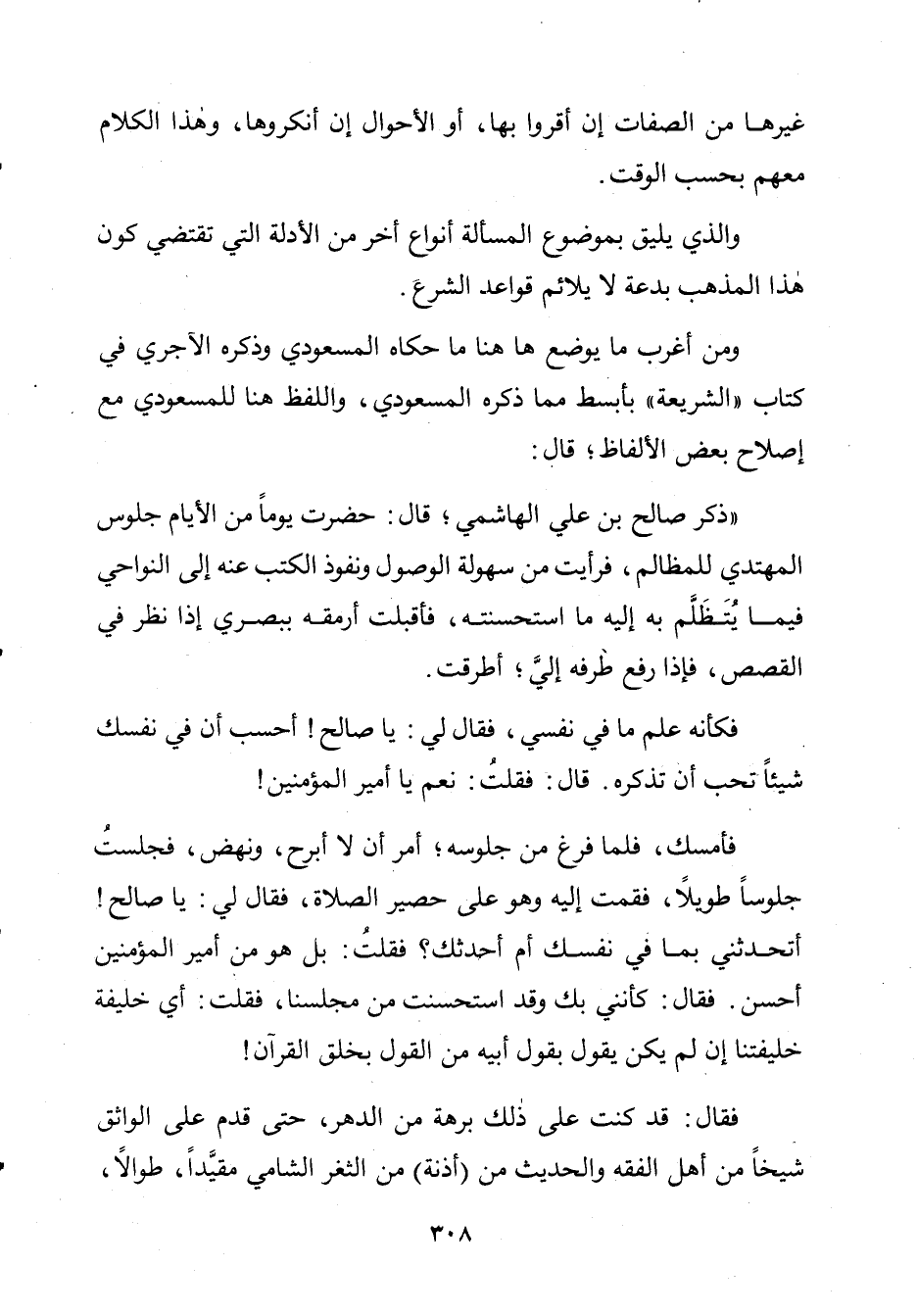 فَأَمْسَكَ، فَلَمَّا فَرَغَ مِنْ جُلُوسِهِ؛ أَمَرَ أَنْ لَا أَبْرَحَ، وَنَهَضَ، فَجَلَسْتُ جُلُوسًا طَوِيلًا، فَقُمْتُ إِلَيْهِ وَهُوَ عَلَى حَصِيرِ الصَّلَاةِ، فَقَالَ لِي: يَا صَالِحُ! أَتُحَدِّثُنِي بِمَا فِي نَفْسِكَ أَمْ أُحَدِّثُكَ؟ فَقُلْتُ: بَلْ هُوَ مِنْ أَمِيرِ الْمُؤْمِنِينَ أَحْسَنُ. فَقَالَ: كَأَنَّنِي بِكَ وَقَدِ اسْتَحْسَنْتَ مِنْ مَجْلِسِنَا، فَقُلْتُ: أَيُّ خَلِيفَةٍ خَلِيفَتُنَا إِنْ لَمْ يَكُنْ يَقُولُ بِقَوْلِ أَبِيهِ مِنَ الْقَوْلِ بِخَلْقِ الْقُرْآنِ!.