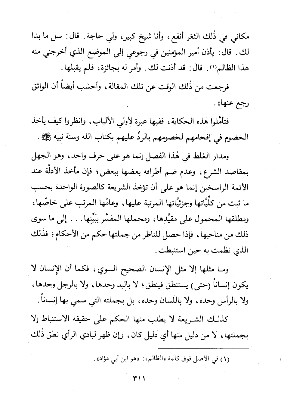وَمَدَارُ الْغَلَطِ فِي هَذَا الْفَصْلِ إِنَّمَا هُوَ عَلَى حَرْفٍ وَاحِدٍ، وَهُوَ الْجَهْلُ بِمَقَاصِدِ الشَّرْعِ، وَعَدَمِ ضَمِّ أَطْرَافِهِ بَعْضِهَا بِبَعْضٍ؛ فَإِنَّ مَأْخَذَ الْأَدِلَّةِ عِنْدَ الْأَئِمَّةِ الرَّاسِخِينَ إِنَّمَا هُوَ عَلَى أَنْ تُؤْخَذَ الشَّرِيعَةُ كَالصُّورَةِ الْوَاحِدَةِ بِحَسْبِ مَا ثَبَتَ مِنْ كُلِّيَّاتِهَا وَجُزْئِيَّاتِهَا الْمُرَتَّبَةِ عَلَيْهَا، وَعَامِّهَا الْمُرَتَّبِ عَلَى خَاصِّهَا، وَمُطْلَقِهَا الْمَحْمُولِ عَلَى مُقَيَّدِهَا، وَمُجْمَلِهَا الْمُفَسَّرِ بِبَيِّنِهَا. . . . إِلَى مَا سِوَى ذَلِكَ مِنْ مَنَاحِيهَا، فَإِذَا حَصَلَ لِلنَّاظِرِ مِنْ جُمْلَتِهَا حُكْمٌ مِنَ الْأَحْكَامِ؛ فَذَلِكَ الَّذِي نَظُمَتْ بِهِ حِينَ اسْتُنْبِطَتْ.