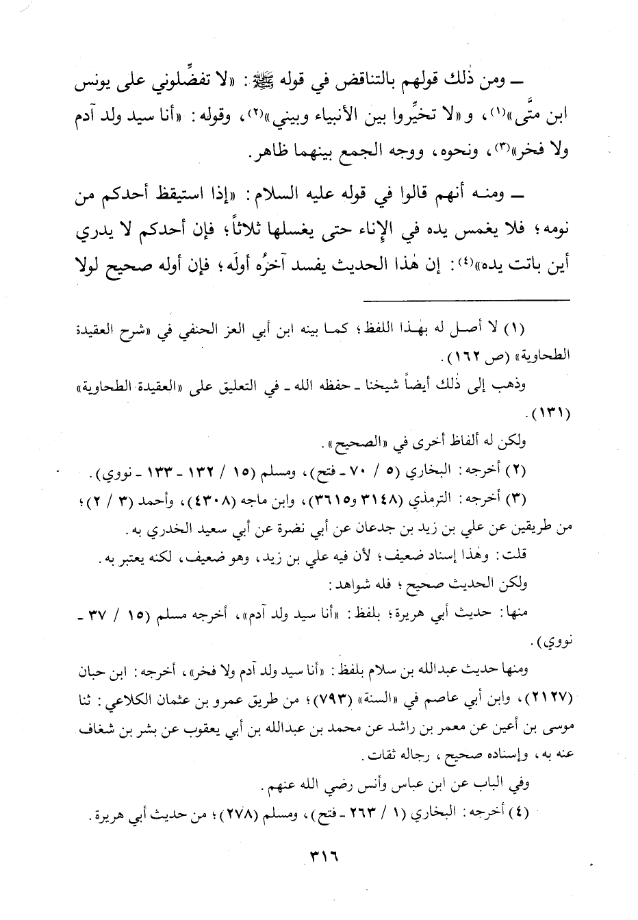 وَمِنْ ذَلِكَ قَوْلُهُمْ بِالتَّنَاقُضِ فِي قَوْلِهِ صَلَّى اللَّهُ عَلَيْهِ وَسَلَّمَ: «لَا تُفَضِّلُونِي عَلَى يُونُسَ بْنَ مَتَّى» "، وَ " «لَا تُخَيِّرُوا بَيْنَ الْأَنْبِيَاءِ وَبَيْنِي»، وَقَوْلِهِ: «أَنَا سَيِّدُ وَلَدِ آدَمَ وَلَا فَخْرَ»، وَوَجْهُ الْجَمْعِ بَيْنَهُمَا ظَاهِرٌ.
