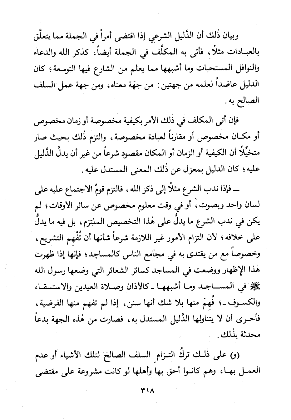 وَبَيَانُ ذَلِكَ أَنَّ الدَّلِيلَ الشَّرْعِيَّ إِذَا اقْتَضَى أَمْرًا فِي الْجُمْلَةِ مِمَّا يَتَعَلَّقُ بِالْعِبَادَاتِ مَثَلًا، فَأَتَى بِهِ الْمُكَلَّفُ فِي الْجُمْلَةِ أَيْضًا، كَذِكْرِ اللَّهِ وَالدُّعَاءِ وَالنَّوَافِلِ الْمُسْتَحَبَّاتِ وَمَا أَشْبَهَهَا مِمَّا يُعْلَمُ مِنَ الشَّارِعِ فِيهَا التَّوْسِعَةُ؛ كَانَ الدَّلِيلُ عَاضِدًا لِعِلْمِهِ مِنْ جِهَتَيْنِ: مِنْ جِهَةِ مَعْنَاهُ، وَمِنْ جِهَةِ عَمَلِ السَّلَفِ الصَّالِحِ بِهِ.