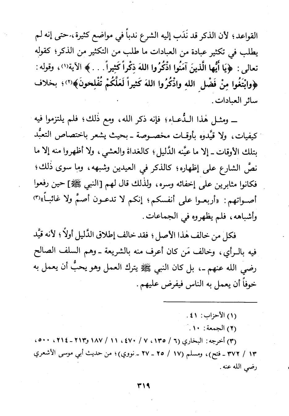 وَمِثْلُ هَذَا الدُّعَاءُ؛ فَإِنَّهُ ذِكْرُ اللَّهِ، وَمَعَ ذَلِكَ؛ فَلَمْ يَلْتَزِمُوا فِيهِ كَيْفِيَّاتٍ، وَلَا قَيَّدُوهُ بِأَوْقَاتٍ مَخْصُوصَةٍ ـ بِحَيْثُ تَشْعُرُ بِاخْتِصَاصِ التَّعَبُّدِ بِتِلْكَ الْأَوْقَاتِ، إِلَّا مَا عَيَّنَهُ الدَّلِيلُ؛ كَالْغَدَاةِ وَالْعَشِيِّ. وَلَا أَظْهَرُوا مِنْهُ إِلَّا مَا نَصَّ الشَّارِعُ عَلَى إِظْهَارِهِ؛ كَالذِّكْرِ فِي الْعِيدَيْنِ وَشِبَهِهِ، وَمَا سِوَى ذَلِكَ؛ فَكَانُوا مُثَابِرِينَ عَلَى إِخْفَائِهِ وَسِرِّهِ، وَلِذَلِكَ قَالَ لَهُمْ [النَّبِيُّ صَلَّى اللَّهُ عَلَيْهِ وَسَلَّمَ] حِينَ رَفَعُوا أَصْوَاتَهُمْ: «أَرْبِعُوا عَلَى أَنْفُسِكُمْ؛ إِنَّكُمْ لَا تَدْعُونَ أَصَمَّ وَلَا غَائِبًا»، وَأَشْبَاهُهُ، وَلِمَ يُظْهِرُوهُ فِي الْجَمَاعَاتِ.