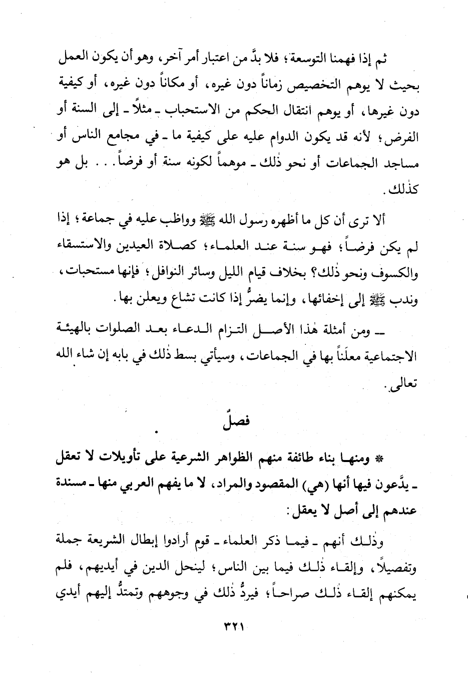 ثُمَّ إِذَا فَهِمْنَا التَّوْسِعَةَ؛ فَلَا بُدَّ مِنَ اعْتِبَارِ أَمْرٍ آخَرَ، وَهُوَ أَنْ يَكُونَ الْعَمَلُ بِحَيْثُ لَا يُوهِمُ التَّخْصِيصُ زَمَانًا دُونَ غَيْرِهِ، أَوْ مَكَانًا دُونَ غَيْرِهِ، أَوْ كَيْفِيَّةٍ دُونَ غَيْرِهَا، أَوْ يُوهِمُ انْتِقَالَ الْحُكْمِ مِنْ الِاسْتِحْبَابِ ـ مَثَلًا ـ إِلَى السُّنَّةِ أَوِ الْفَرْضِ؛ لِأَنَّهُ قَدْ يَكُونُ الدَّوَامُ عَلَيْهِ عَلَى كَيْفِيَّةٍ مَا ـ فِي مَجَامِعِ النَّاسِ أَوْ مَسَاجِدِ الْجَمَاعَاتِ أَوْ نَحْوِ ذَلِكَ ـ مُوهِمًا لِكَوْنِهِ سُنَّةً أَوْ فَرْضًا. . . . بَلْ هُوَ كَذَلِكَ.