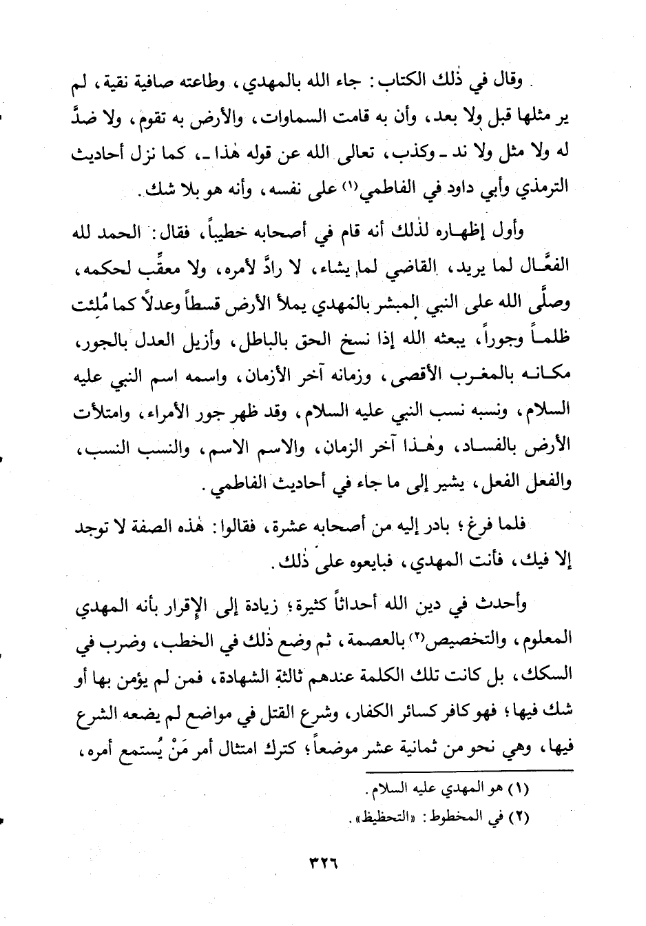 وَقَالَ فِي ذَلِكَ الْكِتَابِ: جَاءَ اللَّهُ بِالْمَهْدِيِّ، وَطَاعَتُهُ صَافِيَةٌ نَقِيَّةٌ، لَمْ يُرَ مِثْلُهَا قَبْلُ وَلَا بَعْدُ، وَأَنَّ بِهِ قَامَتِ السَّمَاوَاتُ وَالْأَرْضُ بِهِ تَقُومُ، وَلَا ضِدَّ لَهُ وَلَا مِثْلَ وَلَا نِدَّ وَلَا كَذِبَ، تَعَالَى اللَّهُ عَنْ قَوْلِهِ وَهَذَا ـ، كَمَا نَزَّلَ أَحَادِيثَ التِّرْمِذِيِّ وَأَبِي دَاوُدَ فِي الْفَاطِمِيِّ عَلَى نَفْسِهِ، وَأَنَّهُ هُوَ بِلَا شَكٍّ.