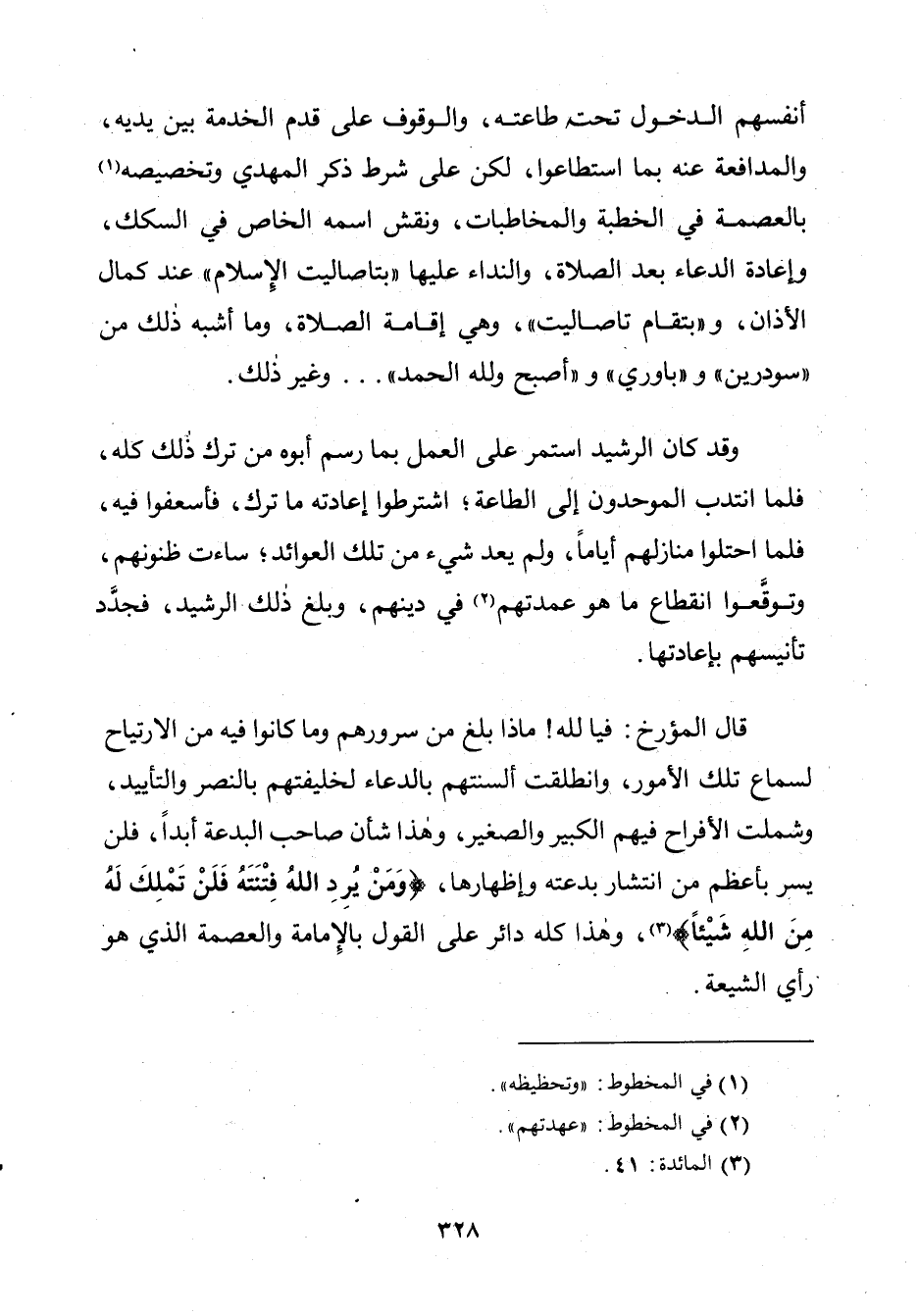 قَالَ الْمُؤَرِّخُ: فَيَا لَلَّهِ! مَاذَا بَلَغَ مِنْ سُرُورِهِمْ وَمَا كَانُوا فِيهِ مِنْ الِارْتِيَاحِ لِسَمَاعِ تِلْكَ الْأُمُورِ، وَانْطَلَقَتْ أَلْسِنَتُهُمْ بِالدُّعَاءِ لِخَلِيفَتِهِمْ بِالنَّصْرِ وَالتَّأْيِيدِ، وَشَمَلَتِ الْأَفْرَاحُ فِيهِمُ الْكَبِيرَ وَالصَّغِيرَ، وَهَذَا شَأْنُ صَاحِبِ الْبِدْعَةِ أَبَدًا، فَلَنْ يُسَرَّ بِأَعْظَمَ مِنَ انْتِشَارِ بِدَعَتِهِ وَإِظْهَارِهَا، {وَمَنْ يُرِدِ اللَّهُ فِتْنَتَهُ فَلَنْ تَمْلِكَ لَهُ مِنَ اللَّهِ شَيْئًا} [المائدة: 41]، وَهَذَا كُلُّهُ دَائِرٌ عَلَى الْقَوْلِ بِالْإِمَامَةِ وَالْعِصْمَةِ الَّذِي هُوَ رَأْيُ الشِّيعَةِ.