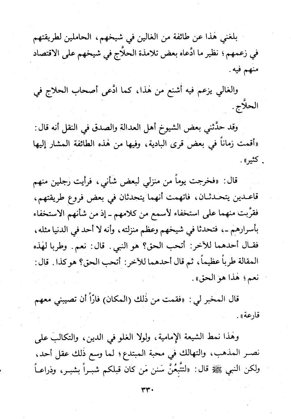 وَهَذَا نَمَطُ الشِّيعَةِ الْإِمَامِيَّةِ، وَلَوْلَا الْغُلُوُّ فِي الدِّينِ، وَالتَّكَالُبُ عَلَى نَصْرِ الْمَذْهَبِ، وَالتَّهَالُكِ فِي مَحَبَّةِ الْمُبْتَدَعِ؛ لَمَا وَسِعَ ذَلِكَ عَقْلُ أَحَدٍ، وَلَكِنَّ النَّبِيَّ صَلَّى اللَّهُ عَلَيْهِ وَسَلَّمَ قَالَ: «لَتَتَّبِعُنَّ سَنَنَ مَنْ كَانَ قَبْلَكُمْ شِبْرًا بِشِبْرٍ، وَذِرَاعًا