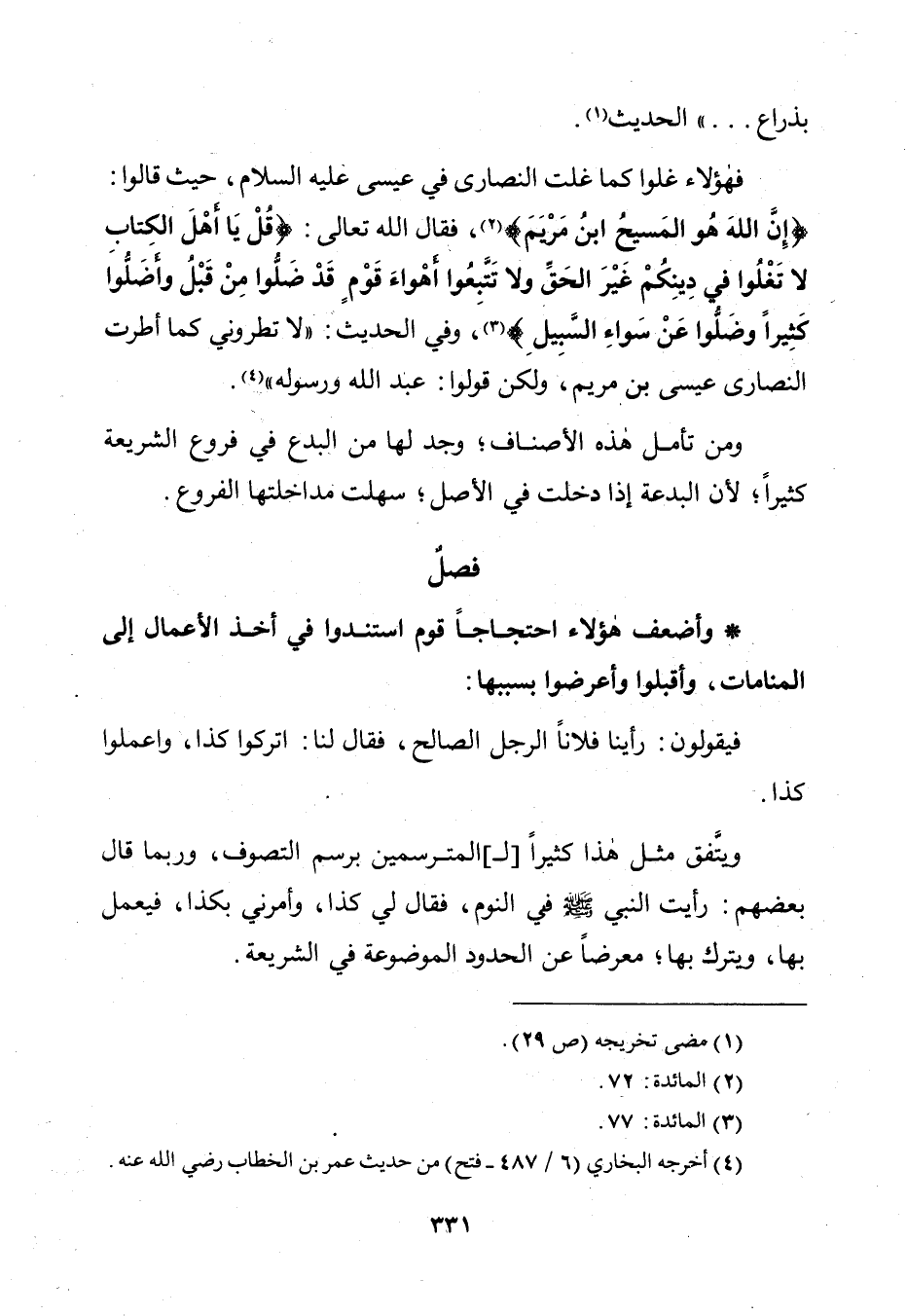 فَهَؤُلَاءِ غَلَوْا كَمَا غَلَتِ النَّصَارَى فِي عِيسَى عَلَيْهِ السَّلَامُ، حَيْثُ قَالُوا: {إِنَّ اللَّهَ هُوَ الْمَسِيحُ ابْنُ مَرْيَمَ} [المائدة: 17]، فَقَالَ اللَّهُ تَعَالَى: {قُلْ يَاأَهْلَ الْكِتَابِ لَا تَغْلُوا فِي دِينِكُمْ غَيْرَ الْحَقِّ وَلَا تَتَّبِعُوا أَهْوَاءَ قَوْمٍ قَدْ ضَلُّوا مِنْ قَبْلُ وَأَضَلُّوا كَثِيرًا وَضَلُّوا عَنْ سَوَاءِ السَّبِيلِ} [المائدة: 77]، وَفِي الْحَدِيثِ: «وَلَا تُطْرُونِي كَمَا أَطْرَتِ النَّصَارَى عِيسَى ابْنَ مَرْيَمَ، وَلَكِنْ قُولُوا: عَبْدُ اللَّهِ وَرَسُولُهُ».