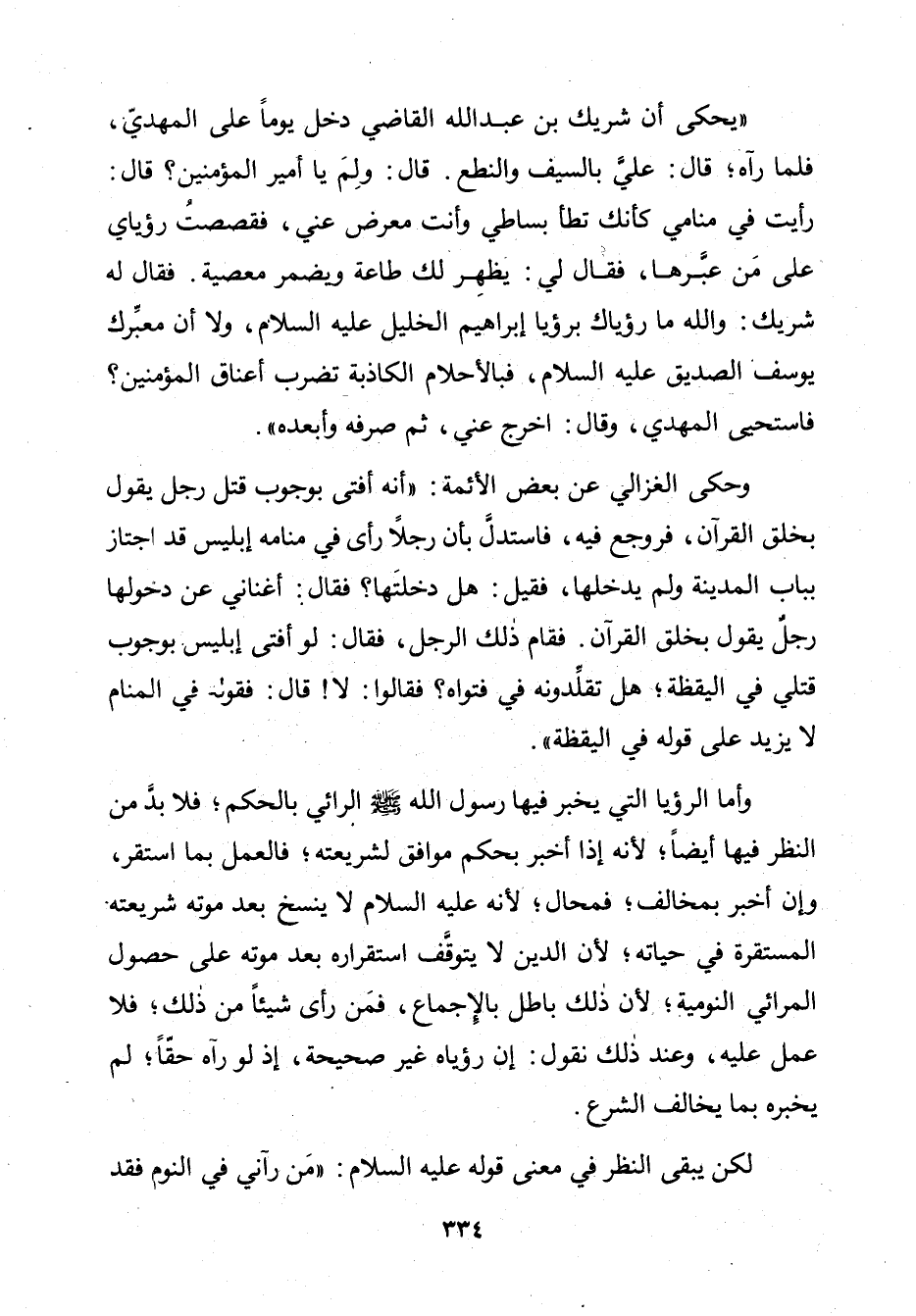 " يُحْكَى أَنَّ شَرِيكَ بْنَ عَبْدِ اللَّهِ الْقَاضِي دَخَلَ عَلَى الْمَهْدِيِّ، فَلَمَّا رَآهُ؛ قَالَ: عَلَيَّ بِالسَّيْفِ وَالنَّطْعِ، قَالَ: وَلِمَ يَا أَمِيرَ الْمُؤْمِنِينَ؟ قَالَ: رَأَيْتُ فِي مَنَامِي كَأَنَّكَ تَطَأُ بِسَاطِي وَأَنْتَ مُعْرِضٌ عَنِّي، فَقَصَصْتُ رُؤْيَايَ عَلَى مَنْ عَبَرَهَا، فَقَالَ لِي: يُظْهِرُ لَكَ طَاعَةً وَيُضْمِرُ مَعْصِيَةً. فَقَالَ لَهُ شَرِيكٌ: وَاللَّهِ مَا رُؤْيَاكَ بِرُؤْيَا إِبْرَاهِيمَ الْخَلِيلِ عَلَيْهِ السَّلَامُ، وَلَا أَنَّ مُعَبِّرَكَ بِيُوسُفَ الصِّدِّيقِ عَلَيْهِ السَّلَامُ، فَبِالْأَحْلَامِ الْكَاذِبَةِ تَضْرِبُ أَعْنَاقَ الْمُؤْمِنِينَ؟ فَاسْتَحْيَا الْمَهْدِيُّ، وَقَالَ: اخْرُجْ عَنِّي، ثُمَّ صَرَفَهُ وَأَبْعَدَهُ.