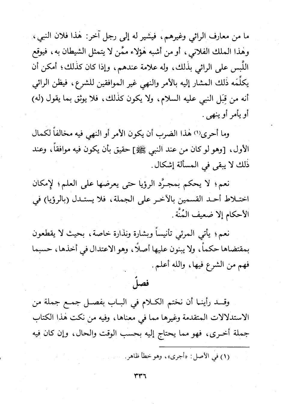 نَعَمْ؛ لَا يَحْكُمُ بِمُجَرَّدِ الرُّؤْيَا حَتَّى يَعْرِضَهَا عَلَى الْعِلْمِ؛ لِإِمْكَانِ اخْتِلَاطِ أَحَدِ الْقِسْمَيْنِ بِالْآخَرِ وَعَلَى الْجُمْلَةِ، فَلَا يَسْتَدِلُّ (بِالرُّؤْيَا) فِي الْأَحْكَامِ إِلَّا ضَعِيفُ الْمِنَّةِ.