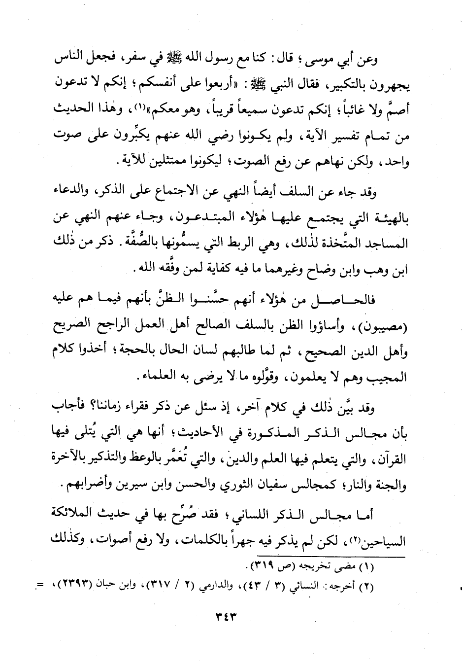 وَعَنْ أَبِي مُوسَى؛ قَالَ: «كُنَّا مَعَ رَسُولِ اللَّهِ صَلَّى اللَّهُ عَلَيْهِ وَسَلَّمَ فِي سَفَرٍ، فَجَعَلَ النَّاسُ يَجْهَرُونَ بِالتَّكْبِيرِ، فَقَالَ النَّبِيُّ صَلَّى اللَّهُ عَلَيْهِ وَسَلَّمَ: أَرْبِعُوا عَلَى أَنْفُسِكُمْ؛ إِنَّكُمْ لَا تَدْعُونَ أَصَمَّ وَلَا غَائِبًا؛ إِنَّكُمْ تَدْعُونَ سَمِيعًا قَرِيبًا، وَهُوَ مَعَكُمْ»، وَهَذَا الْحَدِيثُ مِنْ تَمَامِ تَفْسِيرِ الْآيَةِ، وَلَمْ يَكُونُوا رَضِيَ اللَّهُ عَنْهُمْ يُكَبِّرُونَ عَلَى صَوْتٍ وَاحِدٍ، وَلَكِنَّهُ نَهَاهُمْ عَنْ رَفْعِ الصَّوْتِ؛ لِيَكُونُوا مُمْتَثِلِينَ لِلْآيَةِ.