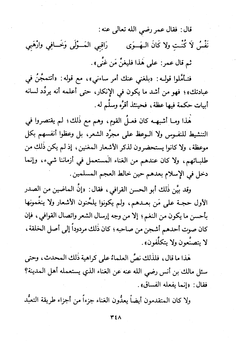 وَقَدْ بَيَّنَ ذَلِكَ أَبُو الْحَسَنِ الْقَرَافِيُّ فَقَالَ: " إِنَّ الْمَاضِينَ مِنَ الصَّدْرِ الْأَوَّلِ حُجَّةٌ عَلَى مَنْ بَعْدَهُمْ، وَلَمْ يَكُونُوا يُلَحِّنُونَ الْأَشْعَارَ وَلَا يُنَغِّمُونَهَا بِأَحْسَنِ مَا يَكُونُ مِنَ النَّغَمِ؛ إِلَّا مِنْ وَجْهِ إِرْسَالِ الشِّعْرِ وَاتِّصَالِ الْقَوَافِي، فَإِنْ كَانَ صَوْتُ أَحَدِهِمْ أَشْجَنَ مِنْ صَاحِبِهِ؛ كَانَ ذَلِكَ مَرْدُودًا إِلَى أَصْلِ الْخِلْقَةِ، لَا يَتَصَنَّعُونَ وَلَا يَتَكَلَّفُونَ ".