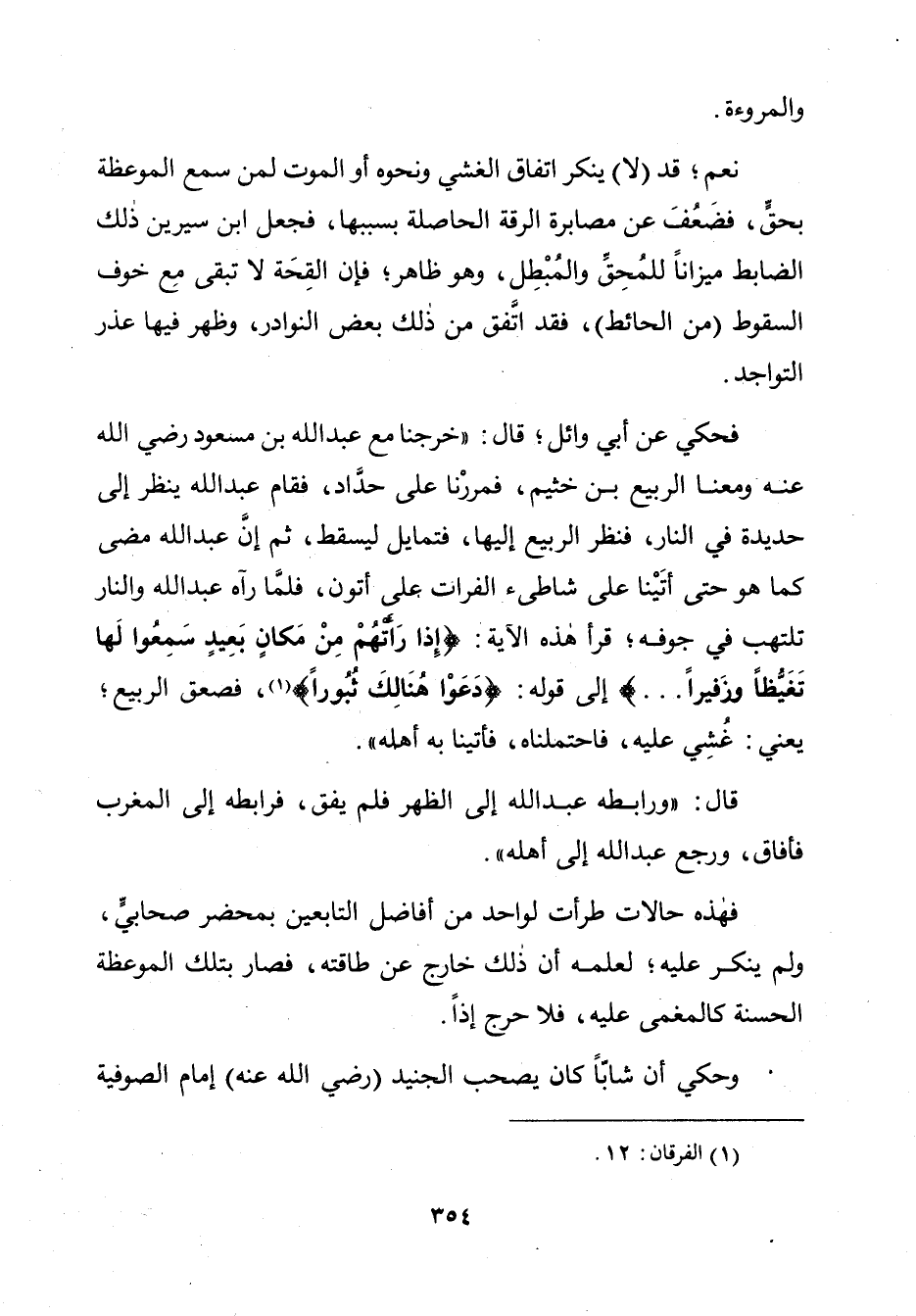 فَحُكِيَ عَنْ أَبِي وَائِلٍ؛ قَالَ: " خَرَجْنَا مَعَ عَبْدِ اللَّهِ بْنِ مَسْعُودٍ رَضِيَ اللَّهُ عَنْهُ وَمَعَنَا الرَّبِيعُ بْنُ خُثَيْمٍ، فَمَرَرْنَا عَلَى حَدَّادٍ، فَقَامَ عَبْدُ اللَّهِ يَنْظُرُ إِلَى حَدِيدَةٍ فِي النَّارِ، فَنَظَرَ الرَّبِيعُ إِلَيْهَا، فَتَمَايَلَ لِيَسْقُطَ، ثُمَّ إِنَّ عَبْدَ اللَّهِ مَضَى كَمَا هُوَ حَتَّى أَتَيْنَا عَلَى شَاطِئِ الْفُرَاتِ عَلَى أَتُونٍ، فَلَمَّا رَآهُ عَبْدُ اللَّهِ وَالنَّارُ تَلْتَهِبُ فِي جَوْفِهِ، قَرَأَ هَذِهِ الْآيَةَ: {إِذَا رَأَتْهُمْ مِنْ مَكَانٍ بَعِيدٍ سَمِعُوا لَهَا تَغَيُّظًا وَزَفِيرًا} [الفرقان: 12]، إِلَى قَوْلِهِ: {دَعَوْا هُنَالِكَ ثُبُورًا} [الفرقان: 13]، فَصَعِقَ الرَّبِيعُ؛ يَعْنِي: غُشِيَ عَلَيْهِ، فَاحْتَمَلْنَاهُ، فَأَتَيْنَا بِهِ أَهْلَهُ.