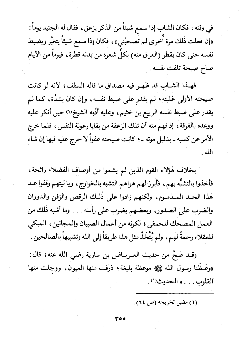 فَهَذَا الشَّابُّ قَدْ ظَهَرَ فِيهِ مِصْدَاقُ مَا قَالَهُ السَّلَفُ؛ لِأَنَّهُ لَوْ كَانَتْ صَيْحَتُهُ الْأَوْلَى غَلَبَتْهُ لَمْ يَقْدِرْ عَلَى ضَبْطِ نَفْسِهِ، وَإِنْ كَانَ بِشِدَّةٍ، كَمَا لَمْ يَقْدِرْ عَلَى ضَبْطِ نَفْسِهِ الرَّبِيعُ بْنُ خُثَيْمٍ، وَعَلَيْهِ أَدَّبَهُ الشَّيْخُ حِينَ أَنْكَرَ عَلَيْهِ وَوَعَدَهُ بِالْفُرْقَةِ، إِذْ فَهِمَ مِنْهُ أَنَّ تِلْكَ الزَّعْقَةَ مِنْ بَقَايَا رُعُونَةِ النَّفْسِ، فَلَمَّا خَرَجَ الْأَمْرُ عَنْ كَسْبِهِ ـ بِدَلِيلِ مَوْتِهِ ـ؛ كَانَتْ صَيْحَتُهُ عَفْوًا لَا حَرَجَ عَلَيْهِ فِيهَا إِنْ شَاءَ اللَّهُ.