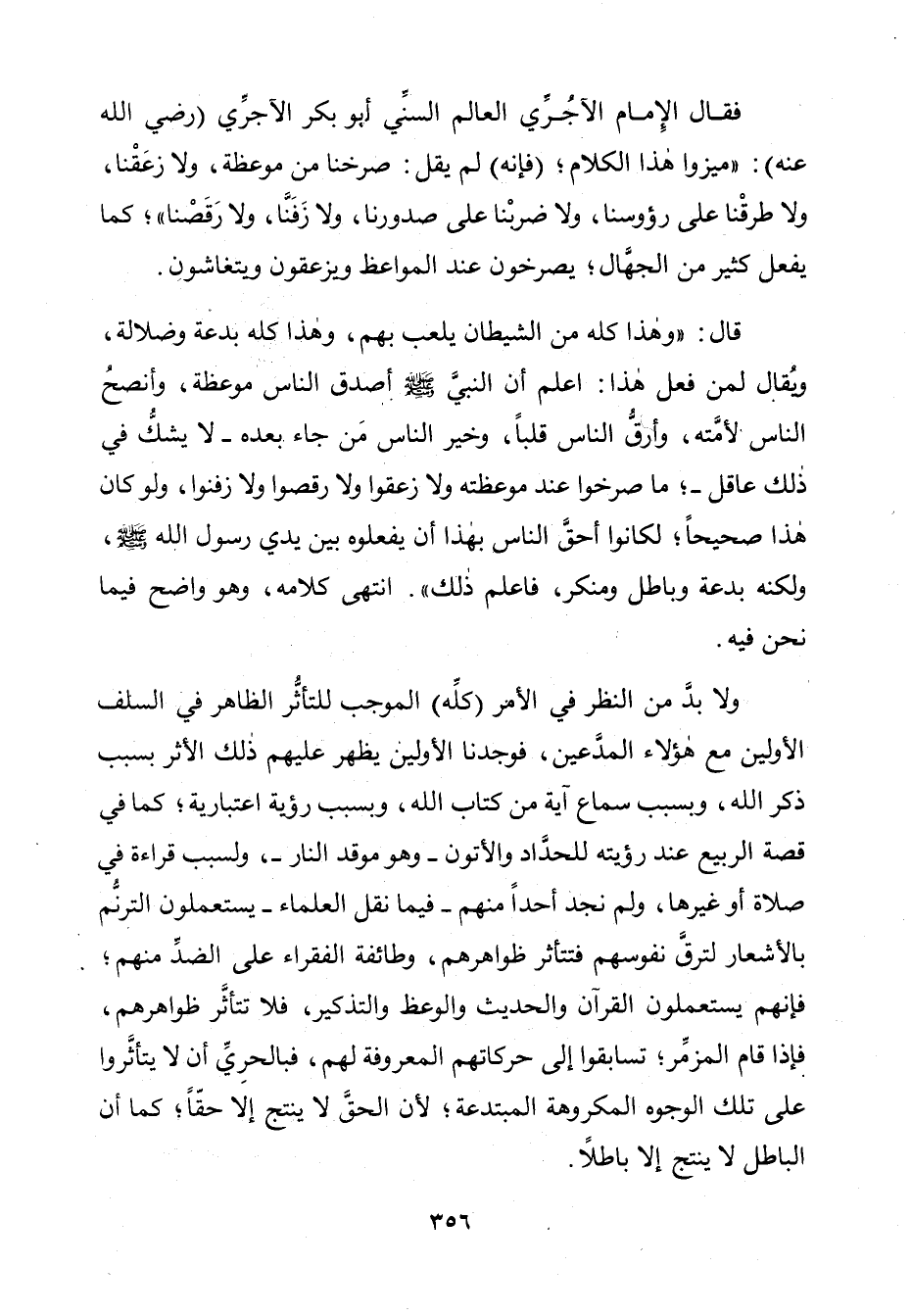 فَقَالَ الْإِمَامُ الْآجُرِّيُّ الْعَالِمُ السُّنِّيُّ أَبُو بَكْرٍ (رَضِيَ اللَّهُ عَنْهُ): " مَيِّزُوا هَذَا الْكَلَامَ؛ فَإِنَّهُ لَمْ يَقُلْ: صَرَخْنَا مِنْ مَوْعِظَةٍ، وَلَا زَعَقْنَا، وَلَا طَرَقْنَا عَلَى رَؤُوسِنَا، وَلَا ضَرَبْنَا عَلَى صُدُورِنَا، وَلَا زَفَنَّا، وَلَا رَقَصْنَا "؛ كَمَا يَفْعَلُ كَثِيرٌ مِنَ الْجُهَّالِ؛ يَصْرُخُونَ عِنْدَ الْمَوَاعِظِ وَيَزْعَقُونَ وَيَتَغَاشَوْنَ.