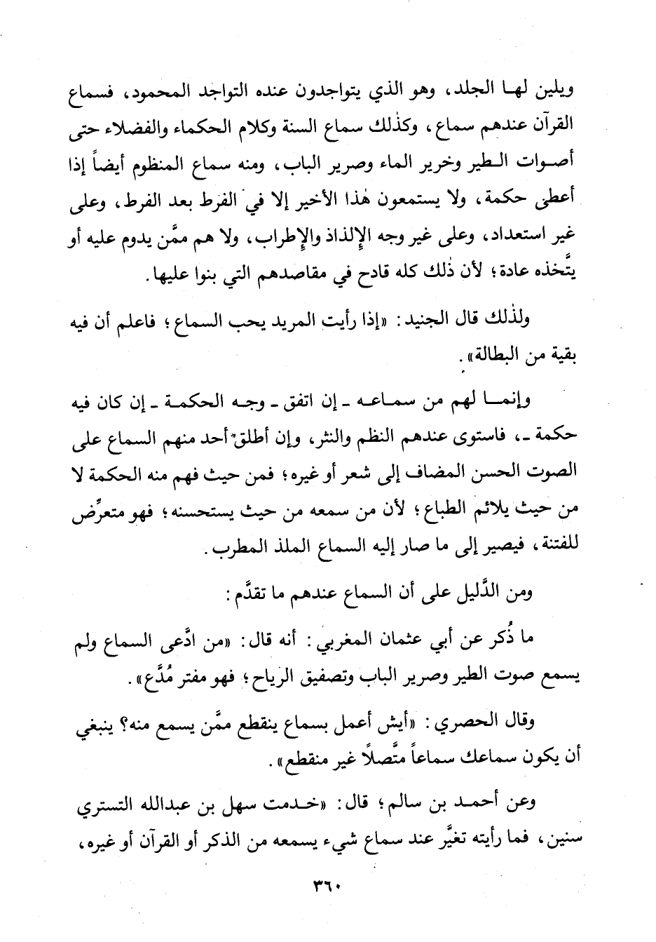 وَيَلِينُ لَهَا الْجِلْدُ، وَهُوَ الَّذِي يَتَوَاجَدُونَ عِنْدَهُ التَّوَاجُدَ الْمَحْمُودَ، فَسَمَاعُ الْقُرْآنِ عِنْدَهُمْ سَمَاعٌ، وَكَذَلِكَ سَمَاعُ السُّنَّةِ وَكَلَامُ الْحُكَمَاءِ وَالْفُضَلَاءِ حَتَّى أَصْوَاتُ الطَّيْرِ وَخَرِيرُ الْمَاءِ وَصَرِيرُ الْبَابِ، وَمِنْهُ سَمَاعُ الْمَنْظُورِ أَيْضًا إِذَا أَعْطَى حِكْمَةً، وَلَا يَسْتَمِعُونَ هَذَا الْأَخِيرَ إِلَّا فِي الْفَرَطِ بَعْدَ الْفَرَطِ، وَعَلَى غَيْرِ اسْتِعْدَادٍ، وَعَلَى غَيْرِ وَجْهِ الْإِلْذَاذِ وَالْإِطْرَابِ، وَلَا هُمْ مِمَّنْ يَدُومُ عَلَيْهِ أَوْ يَتَّخِذُهُ عَادَةً؛ لِأَنَّ ذَلِكَ كُلَّهُ قَادِحٌ فِي مَقَاصِدِهِمُ الَّتِي بَنَوْا عَلَيْهَا.