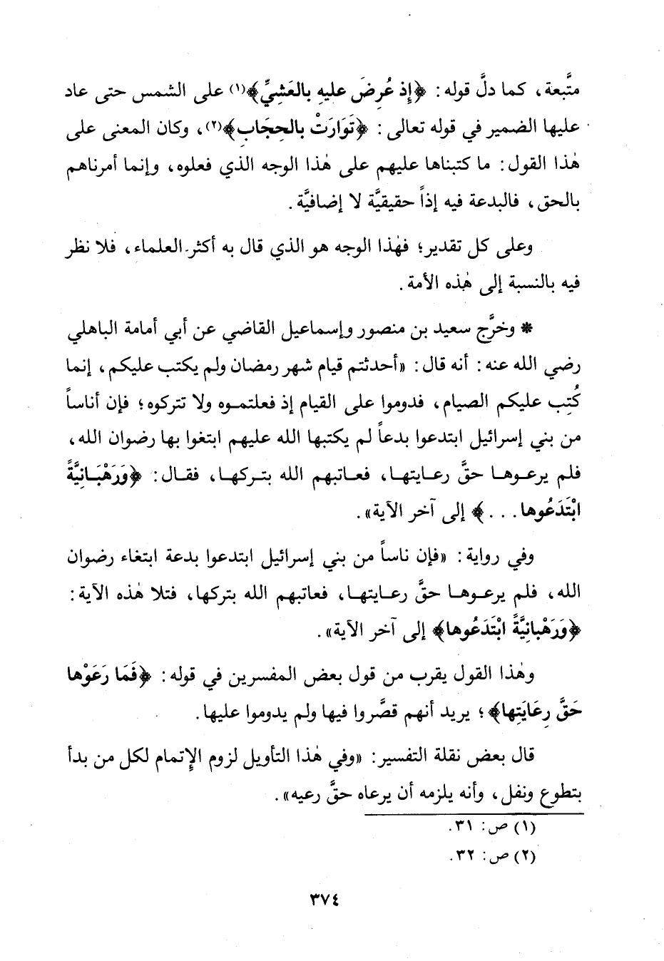 مُتَّبَعَةٌ، كَمَا دَلَّ قَوْلُهُ: {إِذْ عُرِضَ عَلَيْهِ بِالْعَشِيِّ} [ص: 31] عَلَى الشَّمْسِ حَتَّى عَادَ عَلَيْهَا الضَّمِيرُ فِي قَوْلِهِ: {تَوَارَتْ بِالْحِجَابِ} [ص: 32]، وَكَانَ الْمَعْنَى عَلَى هَذَا الْقَوْلِ: مَا كَتَبْنَاهَا عَلَيْهِمْ عَلَى هَذَا الْوَجْهِ الَّذِي فَعَلُوهُ، وَإِنَّمَا أَمَرْنَاهُمْ بِالْحَقِّ، فَالْبِدْعَةُ فِيهِ إِذًا حَقِيقِيَّةٌ لَا إِضَافِيَّةٌ.