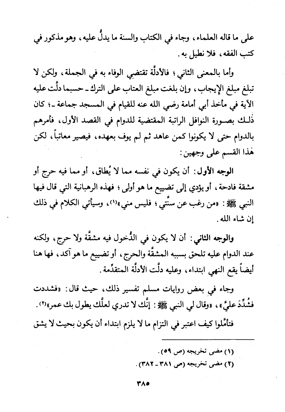 وَأَمَّا الْمَعْنَى الثَّانِي؛ فَالْأَدِلَّةُ تَقْتَضِي الْوَفَاءَ بِهِ فِي الْجُمْلَةِ، وَلَكِنْ لَا تَبْلُغُ مَبْلَغَ الْعِتَابِ عَلَى التَّرْكِ ـ حَسْبَمَا دَلَّتْ عَلَيْهِ الْأَدِلَّةُ فِي مَأْخَذِ أَبِي أُمَامَةَ رَضِيَ اللَّهُ عَنْهُ لِلْقِيَامِ فِي الْمَسْجِدِ جَمَاعَةً ـ؛ كَانَ ذَلِكَ بِصُورَةِ النَّوَافِلِ الرَّاتِبَةِ الْمُقْتَضِيَةِ لِلدَّوَامِ فِي الْقَصْدِ الْأَوَّلِ، فَأَمَرَهُمْ بِالدَّوَامِ حَتَّى لَا يَكُونُوا كَمَنْ عَاهَدَ ثُمَّ لَمْ يُوفِ بِعَهْدِهِ، فَيَصِيرَ مُعَاتَبًا، لَكِنَّ هَذَا الْقَسَمَ عَلَى وَجْهَيْنِ: